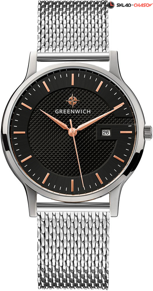 Задняя крышка часов украшена изображениями «розы ветров» и корабля, который является символом марки Greenwich.