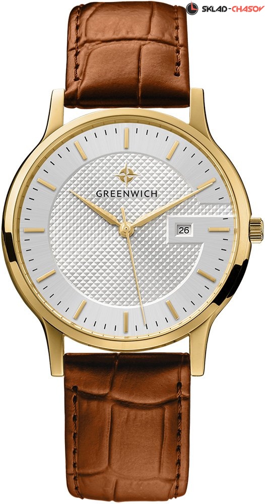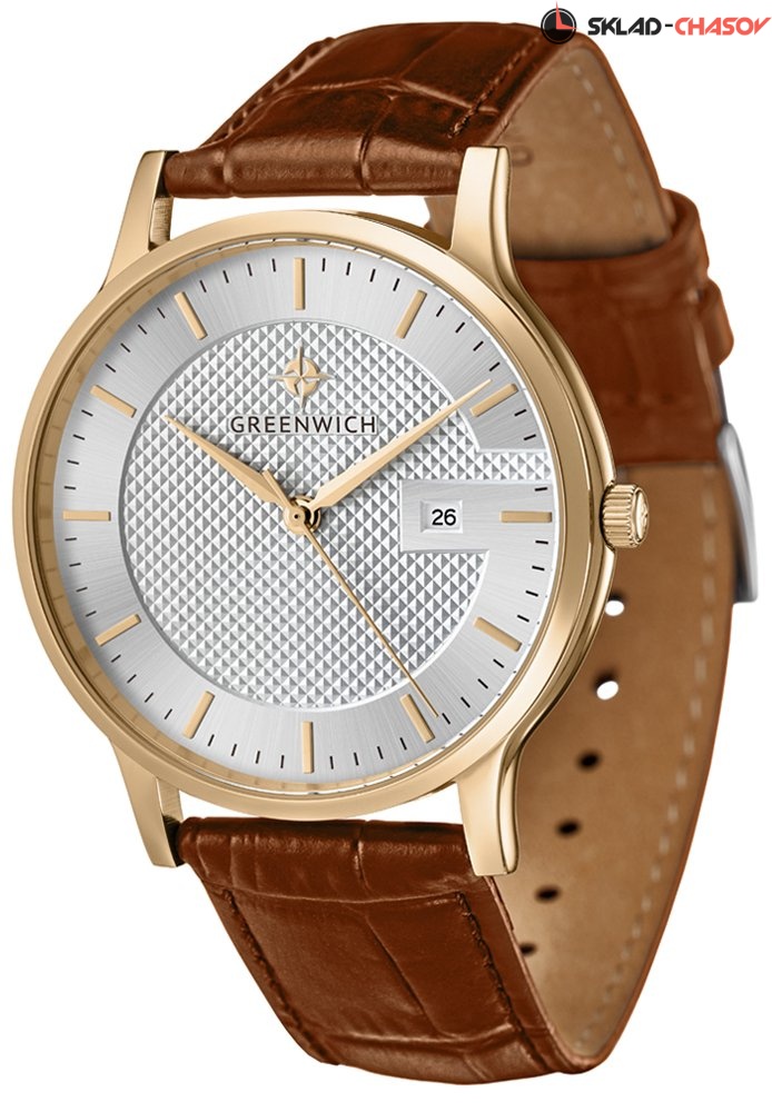 Задняя крышка часов украшена изображениями «розы ветров» и корабля, который является символом марки Greenwich.