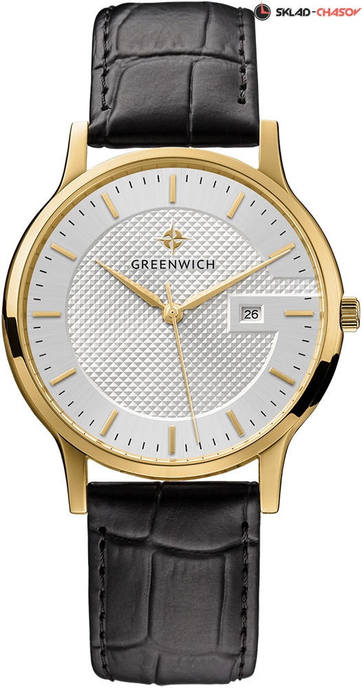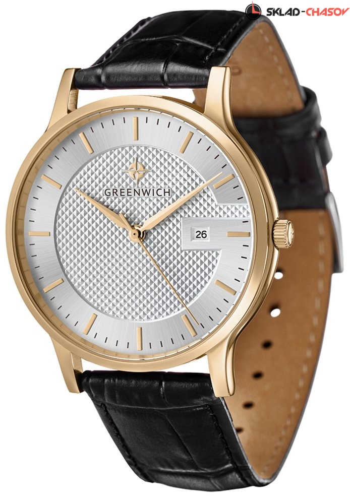 Задняя крышка часов украшена изображениями «розы ветров» и корабля, который является символом марки Greenwich.