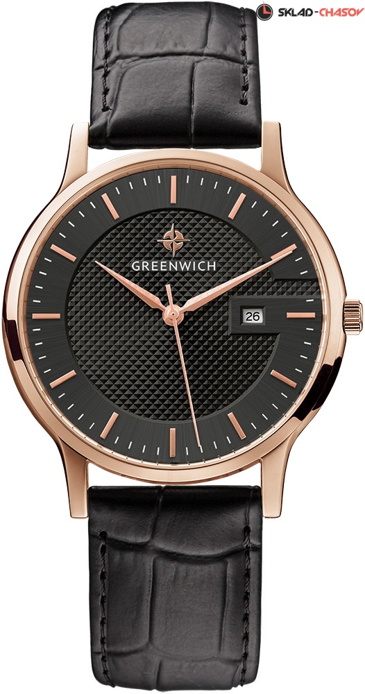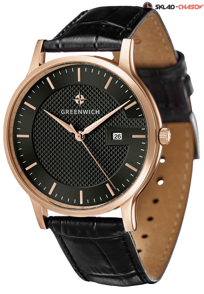 Задняя крышка часов украшена изображениями «розы ветров» и корабля, который является символом марки Greenwich.