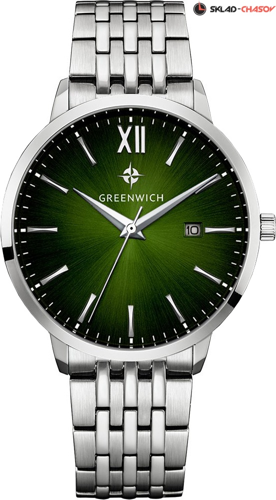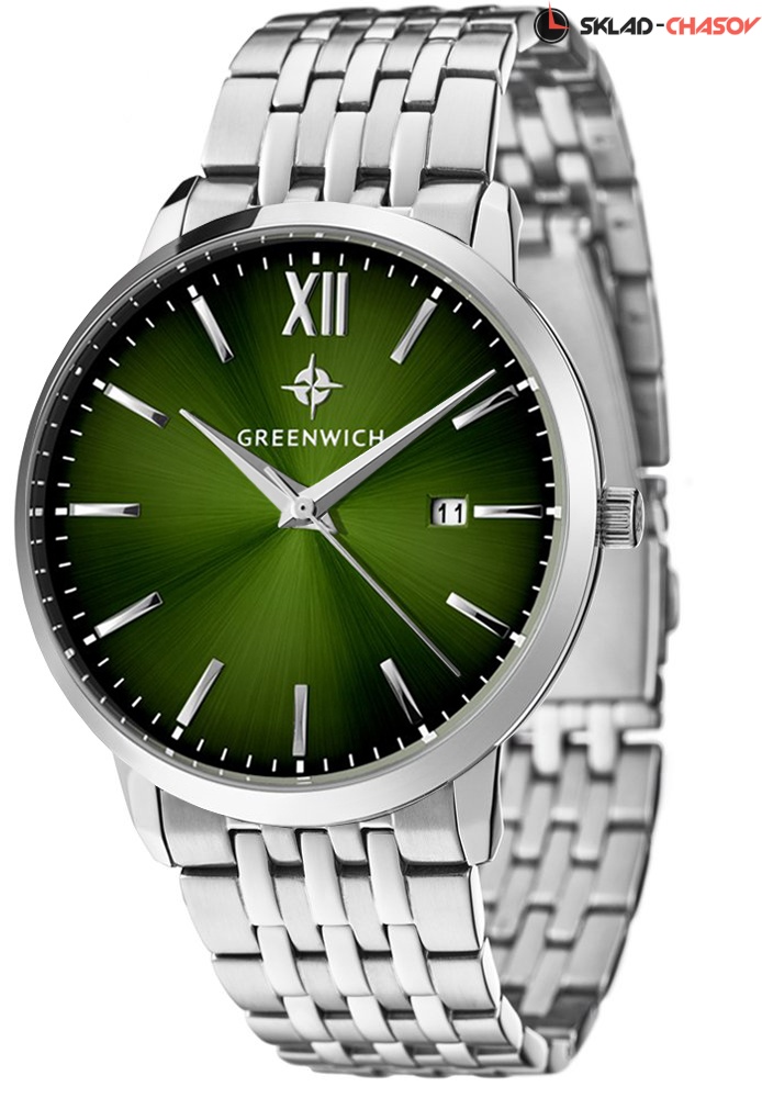 Классические мужские часы серии Brig прекрасно подойдут как под костюм, так и под одежду направления casual. В часах установлен точный японский механизм Miyota. Корпус часов изготовлен из нержавеющей гипоаллергенной стали: он изящно смотрится на руке и не создает неудобств при контакте с одеждой с длинным рукавом. Размер корпуса 41 мм. Полировка на циферблате зеленого цвета выполнена в виде солнечных лучей. Индексы часов изготовлены вручную и закреплены на двух штифтах. Выпуклая форма рисок создает эффект игры солнечных бликов. Объемные часовая и минутная стрелки имеют мечеобразную форму. В модели представлена дополнительная функция – дата. Ее окошко расположено на уровне трех часов. Циферблат надежно защищен минеральным стеклом. На часах установлен браслет из стальных звеньев с надежной застежкой-клипсой. Логотип марки – изображение «розы ветров», символа удачи и новых открытий – расположен на циферблате, заводной головке и внутренней части ремешка. Задняя крышка часов украшена изображениями логотипа и корабля, который является символом марки Greenwich.