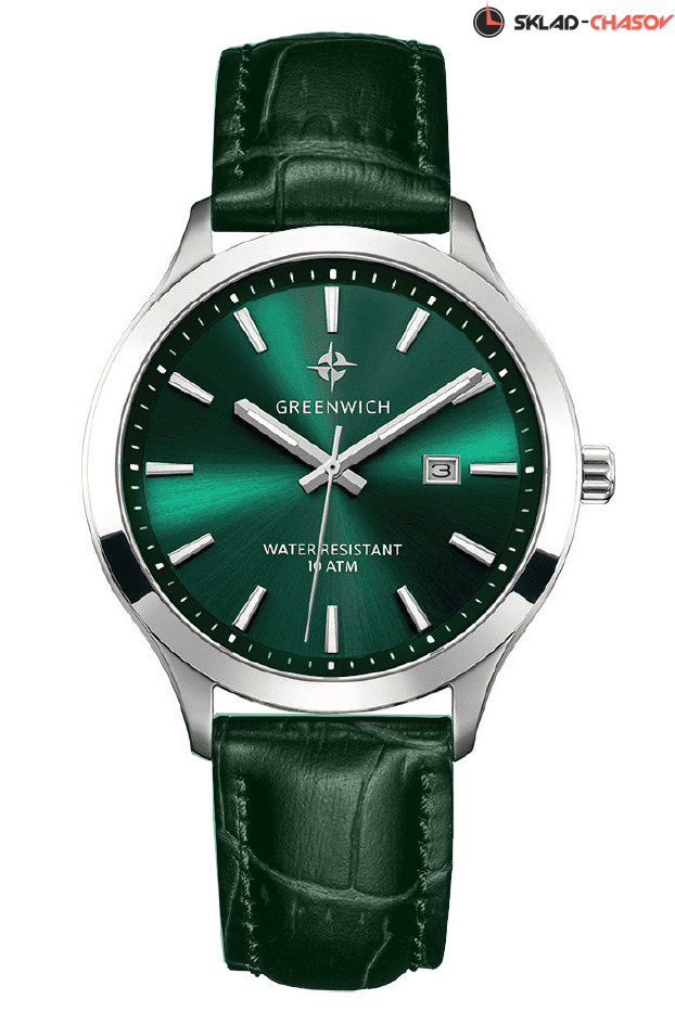 На часах установлен ремешок из натуральной кожи темно-зеленого цвета с прошивкой. Логотип в виде стилизованного изображения «розы ветров» символизирует удачу и новые открытия. Он расположен на циферблате и заводной головке. Задняя крышка часов украшена изображениями «розы ветров» и корабля, которые являются символом бренда Greenwich.