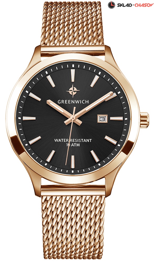 Мужские часы серии Helm – одна из самых популярных моделей марки Greenwich. В часах установлен надежный японский механизм. Корпус часов изготовлен из нержавеющей гипоаллергенной стали. Посередине боковой части корпуса выполнена специальная полировка – вертикальное матирование, что визуально делает корпус тоньше. Размер корпуса 42 мм. Черный циферблат смотрится глубоким и объемным, благодаря «колодцу» по внутреннему краю с нанесенной секундной разметкой. Полировка на циферблате выполнена в стиле солнечных лучей. Индексы часов изготовлены вручную в виде трапеций и закреплены на двух штифтах. На часовую, минутную стрелки и индексы нанесено люминесцентное покрытие, что позволяет определять время в темноте. Часовая и минутная стрелки имеют мечеобразную форму. Это делает их объемными и хорошо читаемыми. Циферблат надежно защищен минеральным стеклом. Водонепроницаемость часов – 10 АТМ, что позволяет заниматься в них водными видами спорта. Завинчивающаяся задняя крышка обеспечивает данный уровень защиты от воды. На часах установлен стальной браслет миланского плетения. Застежка с фиксатором защищает часы от случайного падения. Логотип марки – изображение «розы ветров» - символизирует удачу и новые открытия. Он расположен на циферблате и заводной головке. Задняя крышка часов украшена изображениями «розы ветров» и корабля, который является символом марки Greenwich.