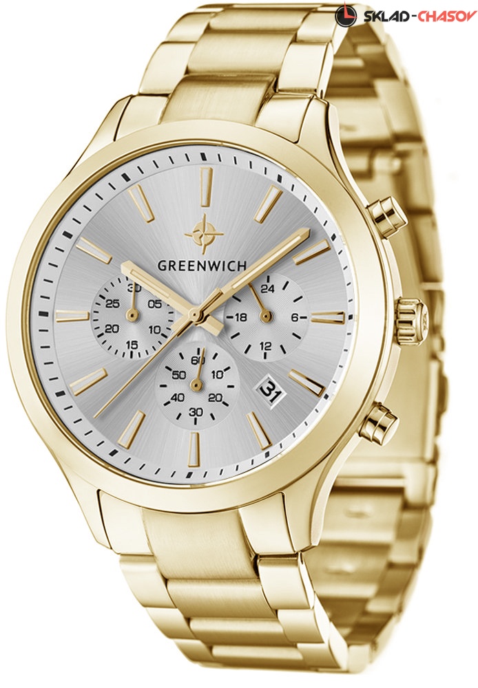 Мужской хронограф серии Skipper – это сочетание повседневного стиля и спортивной функциональности. В часах установлен надежный японский механизм с функциями: часы, минуты, секунды, дата, 24-х часовой индикатор, хронограф. Корпус часов изготовлен из нержавеющей гипоаллергенной стали. Посередине боковой части корпуса выполнена специальная полировка – вертикальное матирование, что визуально делает корпус тоньше. Размер корпуса 42 мм. Черный циферблат смотрится глубоким и объемным, благодаря «колодцу» по внутреннему краю с нанесенной секундной разметкой. Полировка на циферблате выполнена в стиле солнечных лучей. Индикаторы украшены гравировкой в виде концентрических колец и хорошо выделяются на фоне циферблата. Индексы часов изготовлены вручную в виде трапеций и закреплены на двух штифтах. На часовую, минутную стрелки и индексы нанесено люминесцентное покрытие, что позволяет определять время в темноте. Часовая и минутная стрелки имеют мечеобразную форму. Это делает их объемными и хорошо читаемыми. Циферблат надежно защищен минеральным стеклом. Водонепроницаемость часов – 10 АТМ, что позволяет заниматься в них водными видами спорта. Завинчивающаяся задняя крышка обеспечивает данный уровень защиты от воды. На часах установлен литой браслет из нержавеющей стали. Застежка с фиксатором защищает часы от случайного падения. Логотип марки – изображение «розы ветров» - символизирует удачу и новые открытия. Он расположен на циферблате и заводной головке. Задняя крышка часов украшена изображениями «розы ветров» и корабля, который является символом марки Greenwich.