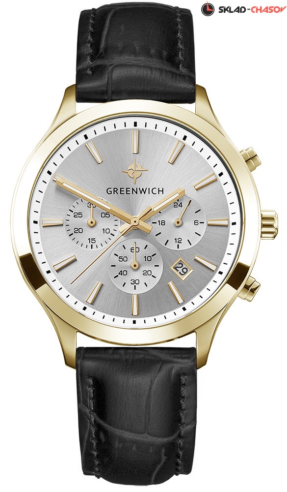 Задняя крышка часов украшена изображениями «розы ветров» и корабля, который является символом марки Greenwich.
