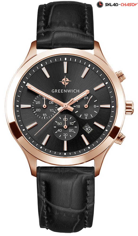 Мужской хронограф серии Skipper – это сочетание повседневного стиля и спортивной функциональности. В часах установлен надежный японский механизм с функциями: часы, минуты, секунды, дата, 24-х часовой индикатор, хронограф. Корпус часов изготовлен из нержавеющей гипоаллергенной стали. Посередине боковой части корпуса выполнена специальная полировка – вертикальное матирование, что визуально делает корпус тоньше. Размер корпуса 42 мм. Черный циферблат смотрится глубоким и объемным, благодаря «колодцу» по внутреннему краю с нанесенной секундной разметкой. Полировка на циферблате выполнена в стиле солнечных лучей. Индикаторы украшены гравировкой в виде концентрических колец и хорошо выделяются на фоне циферблата. Индексы часов изготовлены вручную в виде трапеций и закреплены на двух штифтах. На часовую, минутную стрелки и индексы нанесено люминесцентное покрытие, что позволяет определять время в темноте. Часовая и минутная стрелки имеют мечеобразную форму. Это делает их объемными и хорошо читаемыми. Циферблат надежно защищен минеральным стеклом. Водонепроницаемость часов – 10 АТМ, что позволяет заниматься в них водными видами спорта. Завинчивающаяся задняя крышка обеспечивает данный уровень защиты от воды. На часах установлен черный ремешок из натуральной кожи. Логотип марки – изображение «розы ветров» - символизирует удачу и новые открытия. Он расположен на циферблате и заводной головке. Задняя крышка часов украшена изображениями «розы ветров» и корабля, который является символом марки Greenwich.