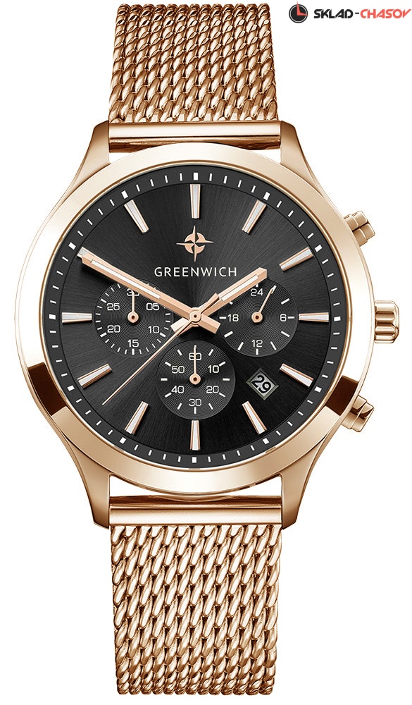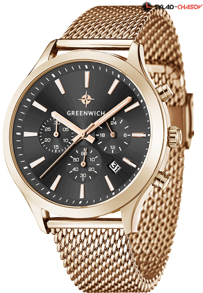 Мужской хронограф серии Skipper – это сочетание повседневного стиля и спортивной функциональности. В часах установлен надежный японский механизм с функциями: часы, минуты, секунды, дата, 24-х часовой индикатор, хронограф. Корпус часов изготовлен из нержавеющей гипоаллергенной стали. Посередине боковой части корпуса выполнена специальная полировка – вертикальное матирование, что визуально делает корпус тоньше. Размер корпуса 42 мм. Черный циферблат смотрится глубоким и объемным, благодаря «колодцу» по внутреннему краю с нанесенной секундной разметкой. Полировка на циферблате выполнена в стиле солнечных лучей. Индикаторы украшены гравировкой в виде концентрических колец и хорошо выделяются на фоне циферблата. Индексы часов изготовлены вручную в виде трапеций и закреплены на двух штифтах. На часовую, минутную стрелки и индексы нанесено люминесцентное покрытие, что позволяет определять время в темноте. Часовая и минутная стрелки имеют мечеобразную форму. Это делает их объемными и хорошо читаемыми. Циферблат надежно защищен минеральным стеклом. Водонепроницаемость часов – 10 АТМ, что позволяет заниматься в них водными видами спорта. Завинчивающаяся задняя крышка обеспечивает данный уровень защиты от воды. На часах установлен ремешок миланское плетение. Логотип марки – изображение «розы ветров» - символизирует удачу и новые открытия. Он расположен на циферблате и заводной головке. Задняя крышка часов украшена изображениями «розы ветров» и корабля, который является символом марки Greenwich.