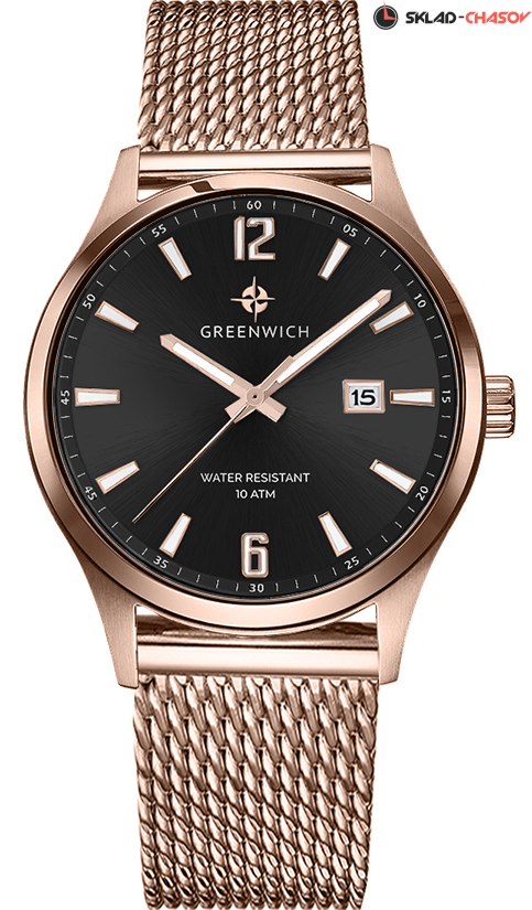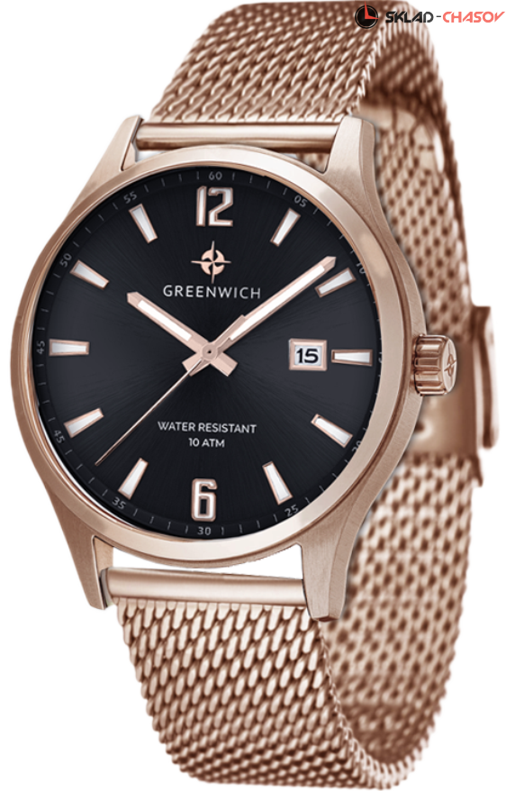 Серия мужских часов Octopus – новинка бренда Greenwich. В часах установлен надежный японский механизм. Корпус часов изготовлен из нержавеющей гипоаллергенной стали с PVD-покрытием из розового золота. На боковой части корпуса выполнена специальная полировка – вертикальное матирование, что визуально делает корпус тоньше. Размер корпуса 43 мм. Черный циферблат смотрится глубоким и объемным, благодаря «колодцу» по внутреннему краю с нанесенной секундной разметкой. Полировка на циферблате выполнена в стиле солнечных лучей. Индексы часов изготовлены вручную в виде трапеций и закреплены на двух штифтах. На часовую, минутную стрелки и индексы нанесено люминесцентное покрытие, что позволяет определять время в темноте. Часовая и минутная стрелки имеют мечеобразную форму. Это делает их объемными и хорошо читаемыми. Циферблат надежно защищен минеральным стеклом. Водонепроницаемость часов – 10 атмосфер, что позволяет заниматься в них водными видами спорта. Завинчивающаяся задняя крышка обеспечивает данный уровень защиты от воды. На часах установлен миланский браслет из нержавеющей стали. Логотип марки – изображение «розы ветров» – символизирует удачу и новые открытия. Он расположен на циферблате, заводной головке и внутренней части ремешка. Задняя крышка часов украшена изображениями «розы ветров» и корабля, который является символом марки Greenwich