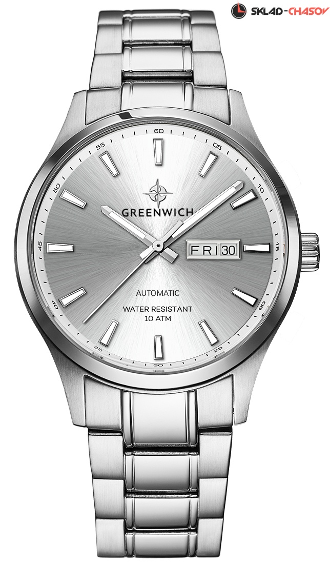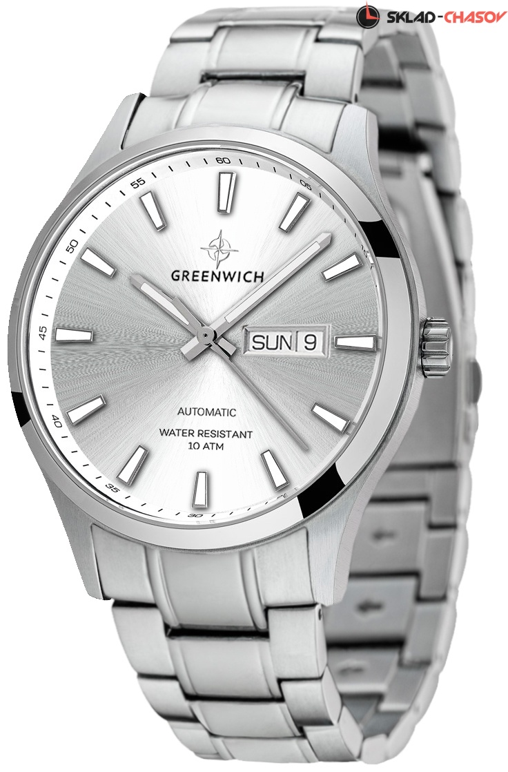 Премьерную коллекцию автоматических часов бренда Greenwich открывает серия Good Luck. Классический корпус диаметром 43 мм с полированным безелем обрамляет циферблат часов. Полировка в виде солнечных лучей и крупные риски, сдвоенное окошко даты и люминесцентное покрытие часовой и минутной стрелок: серебристый циферблат эффектно смотрится, функционален и легко читается при любом освещении. Водостойкость равна 10 атмосфер: в этих часах можно плавать. Сквозь прозрачную заднюю крышку вы увидите детали механизма TMI с декорированным ротором: на нем выгравировано изображение символа английских моряков — парусника и название коллекции. Браслет и застежка-клипса выполнены из гипоаллергенной нержавеющей стали. Дизайн, актуальный для любого современного образа, и надежность используемых материалов делают автоматические часы Greenwich удобным и стильным аксессуаром на каждый день.