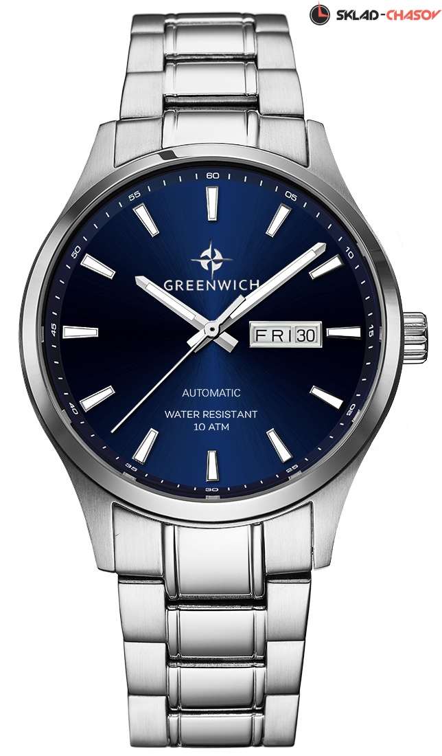 Премьерную коллекцию автоматических часов бренда Greenwich открывает серия Good Luck. Классический корпус диаметром 43 мм с полированным безелем обрамляет циферблат часов. Полировка в виде солнечных лучей, эффект градиента и крупные риски, сдвоенное окошко даты и люминесцентное покрытие часовой и минутной стрелок: синий циферблат эффектно смотрится, функционален и легко читается при любом освещении. Водостойкость равна 10 атмосфер: в этих часах можно плавать. Сквозь прозрачную заднюю крышку вы увидите детали механизма TMI с декорированным ротором: на нем выгравировано изображение символа английских моряков — парусника и название коллекции. Браслет и застежка-клипса выполнены из гипоаллергенной нержавеющей стали. Дизайн, актуальный для любого современного образа, и надежность используемых материалов делают автоматические часы Greenwich удобным и стильным аксессуаром на каждый день.