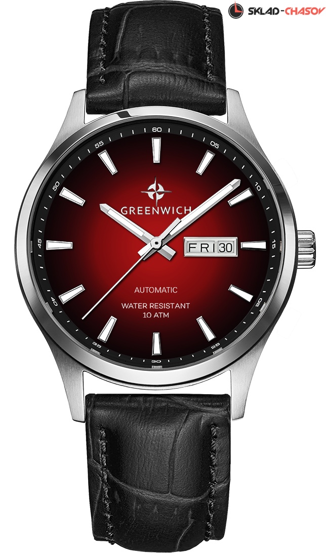 Премьерную коллекцию автоматических часов бренда Greenwich открывает серия Good Luck. Классический корпус диаметром 43 мм с полированным безелем обрамляет циферблат часов. Полировка в виде солнечных лучей, эффект градиента и крупные риски, сдвоенное окошко даты и люминесцентное покрытие часовой и минутной стрелок: красный циферблат эффектно смотрится, функционален и легко читается при любом освещении. Водостойкость равна 10 атмосфер: в этих часах можно плавать. Сквозь прозрачную заднюю крышку вы увидите детали механизма TMI с декорированным ротором: на нем выгравировано изображение символа английских моряков — парусника и название коллекции. Ремешок черного цвета выполнен из натуральной кожи с прошивкой в тон. Дизайн, актуальный для любого современного образа, и надежность используемых материалов делают автоматические часы Greenwich удобным и стильным аксессуаром на каждый день.