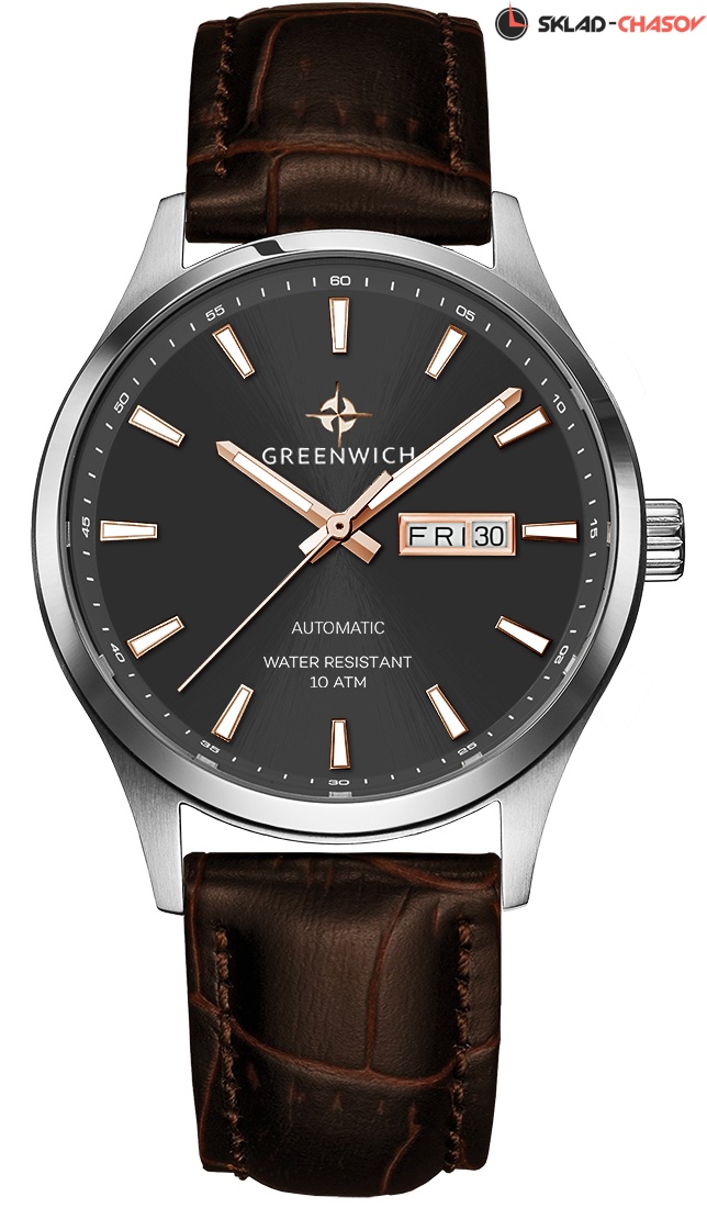 Премьерную коллекцию автоматических часов бренда Greenwich открывает серия Good Luck. Классический корпус диаметром 43 мм с полированным безелем обрамляет циферблат часов. Полировка в виде солнечных лучей и крупные риски, сдвоенное окошко даты и люминесцентное покрытие часовой и минутной стрелок: серый циферблат эффектно смотрится, функционален и легко читается при любом освещении. Водостойкость равна 10 атмосфер: в этих часах можно плавать. Сквозь прозрачную заднюю крышку вы увидите детали механизма TMI с декорированным ротором: на нем выгравировано изображение символа английских моряков — парусника и название коллекции. Ремешок коричневого цвета выполнен из натуральной кожи с прошивкой в тон. Дизайн, актуальный для любого современного образа, и надежность используемых материалов делают автоматические часы Greenwich удобным и стильным аксессуаром на каждый день.