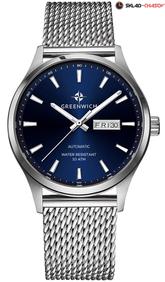 Премьерную коллекцию автоматических часов бренда Greenwich открывает серия Good Luck. Классический корпус диаметром 43 мм с полированным безелем обрамляет циферблат часов. Полировка в виде солнечных лучей, эффект градаента и крупные риски, сдвоенное окошко даты и люминесцентное покрытие часовой и минутной стрелок: синий циферблат эффектно смотрится, функционален и легко читается при любом освещении. Водостойкость равна 10 атмосфер: в этих часах можно плавать. Сквозь прозрачную заднюю крышку вы увидите детали механизма TMI с декорированным ротором: на нем выгравировано изображение символа английских моряков — парусника и название коллекции. Браслет миланского плетения выполнен из нержавеющей стали, специальная застежка позволяет самостоятельно регулировать длину браслета. Дизайн, актуальный для любого современного образа, и надежность используемых материалов делают автоматические часы Greenwich удобным и стильным аксессуаром на каждый день.