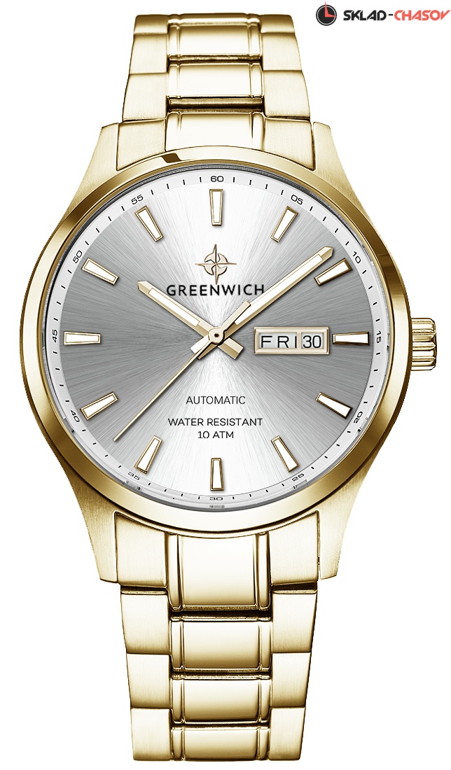 Премьерную коллекцию автоматических часов бренда Greenwich открывает серия Good Luck. Классический корпус диаметром 43 мм с полированным безелем и PVD-покрытием из желтого золота обрамляет циферблат часов. Полировка в виде солнечных лучей и крупные риски, сдвоенное окошко даты и люминесцентное покрытие часовой и минутной стрелок: серебристый циферблат эффектно смотрится, функционален и легко читается при любом освещении. Водостойкость равна 10 атмосфер: в этих часах можно плавать. Сквозь прозрачную заднюю крышку вы увидите детали механизма TMI с декорированным ротором: на нем выгравировано изображение символа английских моряков — парусника и название коллекции. Браслет и застежка-клипса выполнены из гипоаллергенной нержавеющей стали. Дизайн, актуальный для любого современного образа, и надежность используемых материалов делают автоматические часы Greenwich удобным и стильным аксессуаром на каждый день.