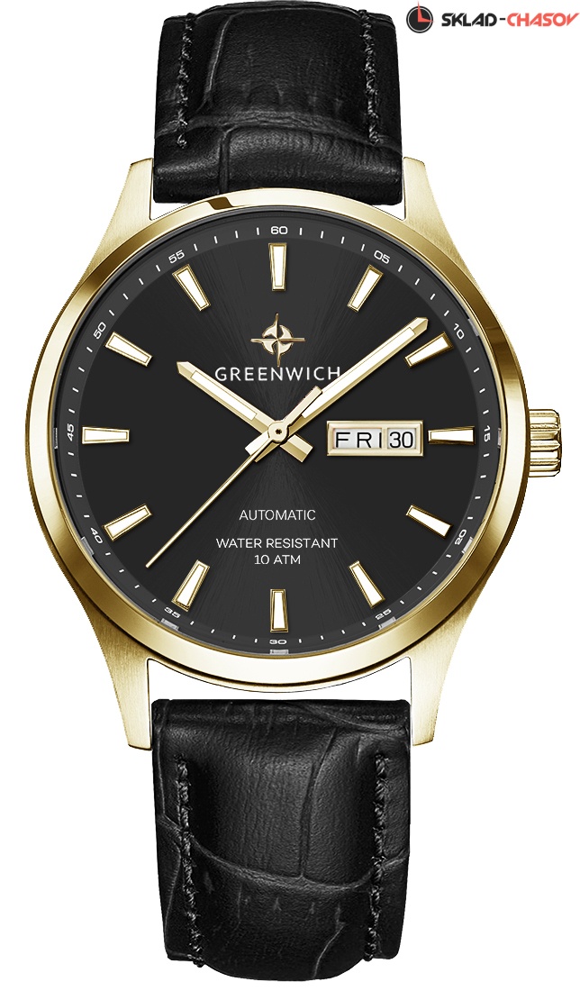 Премьерную коллекцию автоматических часов бренда Greenwich открывает серия Good Luck. Классический корпус диаметром 43 мм с полированным безелем и PVD-покрытием из желтого золота обрамляет циферблат часов. Полировка в виде солнечных лучей и крупные риски, сдвоенное окошко даты и люминесцентное покрытие часовой и минутной стрелок: черный циферблат эффектно смотрится, функционален и легко читается при любом освещении. Водостойкость равна 10 атмосфер: в этих часах можно плавать. Сквозь прозрачную заднюю крышку вы увидите детали механизма TMI с декорированным ротором: на нем выгравировано изображение символа английских моряков — парусника и название коллекции. Ремешок черного цвета выполнен из натуральной кожи с прошивкой в тон. Дизайн, актуальный для любого современного образа, и надежность используемых материалов делают автоматические часы Greenwich удобным и стильным аксессуаром на каждый день.
