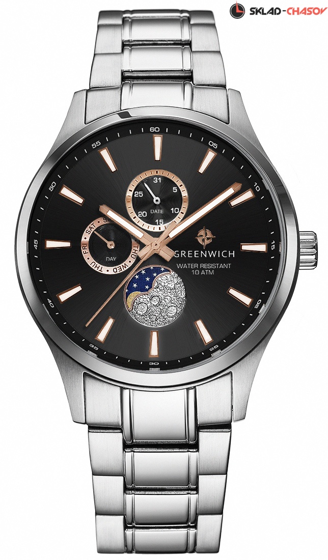 В круглом корпусе из нержавеющей стали заключен кварцевый механизм с полезными функциями даты, дня недели и фаз Луны. Каждый индикатор, расположенный на черном матовом циферблате, выделен накладной рамкой. Индикатор в позиции «6 часов» украшает декоративный элемент с объемным рисунком, который напоминает кратеры на лунной поверхности. Стрелки и риски покрыты люминесцентным составом, который светится в темноте. Повышенная водостойкость часов составляет 10 атмосфер, что позволяет спокойно в них плавать. Модель дополняет классический браслет из нержавеющей стали с удобной в использовании и надежной застежкой-клипсой.