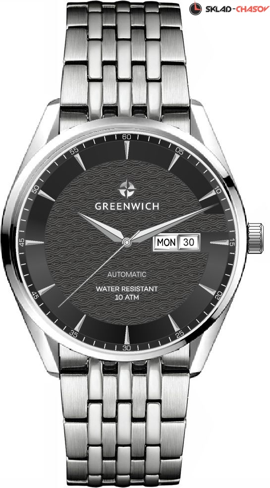 Серия Good Luck Classic входит в коллекцию автоматических часов бренда Greenwich. Классический корпус диаметром 42 мм с полированным безелем и обрамляет черный циферблат часов. В центральной части циферблата — отличительная черта моделей этой серии: гильоше, объемные линии которого напоминают волны. Обратите внимание на форму пластины, где крепятся накладные риски: она сделана в форме латинской буквы G, первой буквы в названии бренда. Водостойкость равна 10 атмосфер: в этих часах можно плавать. Сквозь прозрачную заднюю крышку вы увидите детали механизма TMI с декорированным ротором: на нем выгравировано изображение символа английских моряков — парусника. Браслет и застежка-клипса выполнены из гипоаллергенной нержавеющей стали. Дизайн, актуальный для любого современного образа, и надежность используемых материалов делают автоматические часы Greenwich удобным и стильным аксессуаром на каждый день.