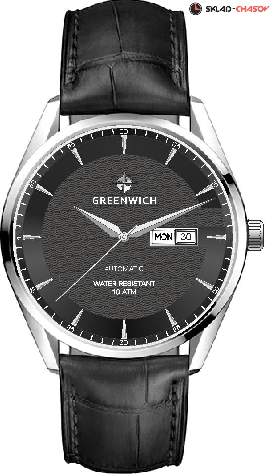 Серия Good Luck Classic входит в коллекцию автоматических часов бренда Greenwich. Классический корпус диаметром 42 мм с полированным безелем обрамляет черный циферблат часов. В центральной части циферблата — отличительная черта моделей этой серии: гильоше, объемные линии которого напоминают волны. Обратите внимание на форму пластины, где крепятся накладные риски: она сделана в форме латинской буквы G, первой буквы в названии бренда. Водостойкость равна 10 атмосфер: в этих часах можно плавать. Сквозь прозрачную заднюю крышку вы увидите детали механизма TMI с декорированным ротором: на нем выгравировано изображение символа английских моряков — парусника. Ремешок черного цвета выполнен из натуральной кожи с прошивкой в тон. Дизайн, актуальный для любого современного образа, и надежность используемых материалов делают автоматические часы Greenwich удобным и стильным аксессуаром на каждый день.