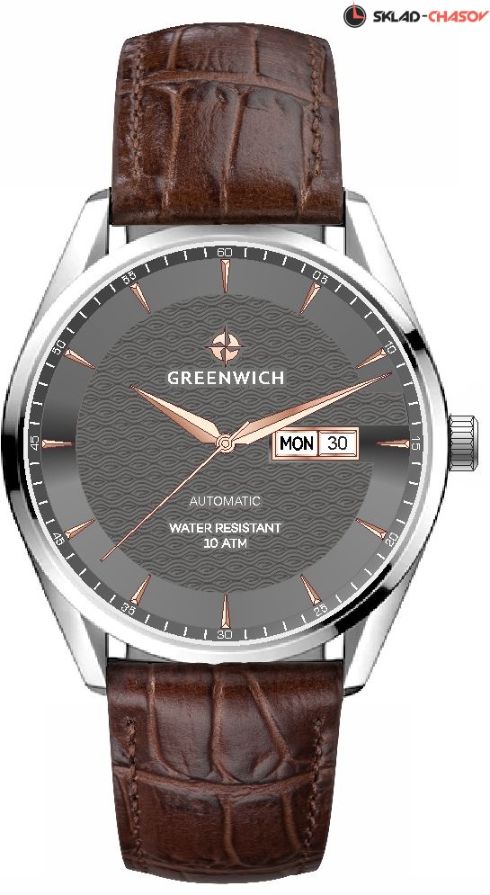 Серия Good Luck Classic входит в коллекцию автоматических часов бренда Greenwich. Классический корпус диаметром 42 мм с полированным безелем обрамляет черный циферблат часов. В центральной части циферблата — отличительная черта моделей этой серии: гильоше, объемные линии которого напоминают волны. Обратите внимание на форму пластины, где крепятся накладные риски: она сделана в форме латинской буквы G, первой буквы в названии бренда. Водостойкость равна 10 атмосфер: в этих часах можно плавать. Сквозь прозрачную заднюю крышку вы увидите детали механизма TMI с декорированным ротором: на нем выгравировано изображение символа английских моряков — парусника. Ремешок черного цвета выполнен из натуральной кожи с прошивкой в тон. Дизайн, актуальный для любого современного образа, и надежность используемых материалов делают автоматические часы Greenwich удобным и стильным аксессуаром на каждый день.