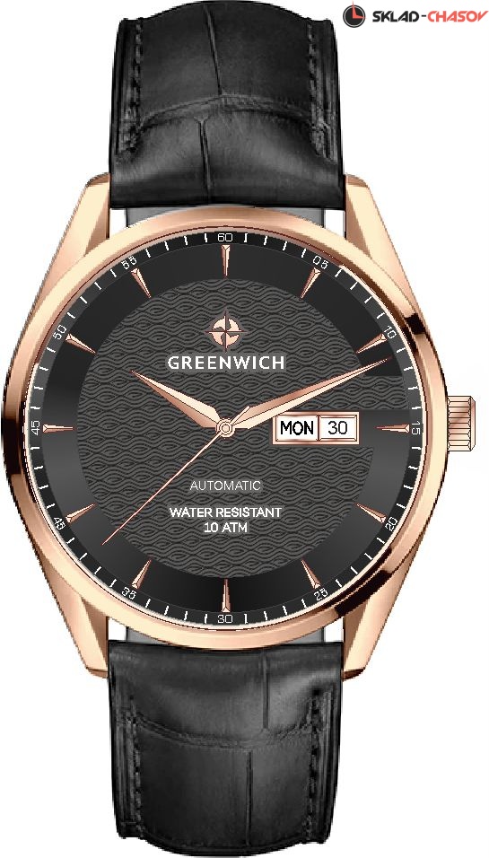 Серия Good Luck Classic входит в коллекцию автоматических часов бренда Greenwich. Классический корпус диаметром 42 мм с PVD-покрытием из розового золота и безелем с зеркальной полировкой обрамляет черный циферблат часов. В центральной части циферблата — отличительная черта моделей этой серии: гильоше, объемные линии которого напоминают волны. Обратите внимание на форму пластины, где крепятся накладные риски: она сделана в форме латинской буквы G, первой буквы в названии бренда. Водостойкость равна 10 атмосфер: в этих часах можно плавать. Сквозь прозрачную заднюю крышку вы увидите детали механизма TMI с декорированным ротором: на нем выгравировано изображение символа английских моряков — парусника. Ремешок черного цвета выполнен из натуральной кожи с прошивкой в тон. Дизайн, актуальный для любого современного образа, и надежность используемых материалов делают автоматические часы Greenwich удобным и стильным аксессуаром на каждый день.