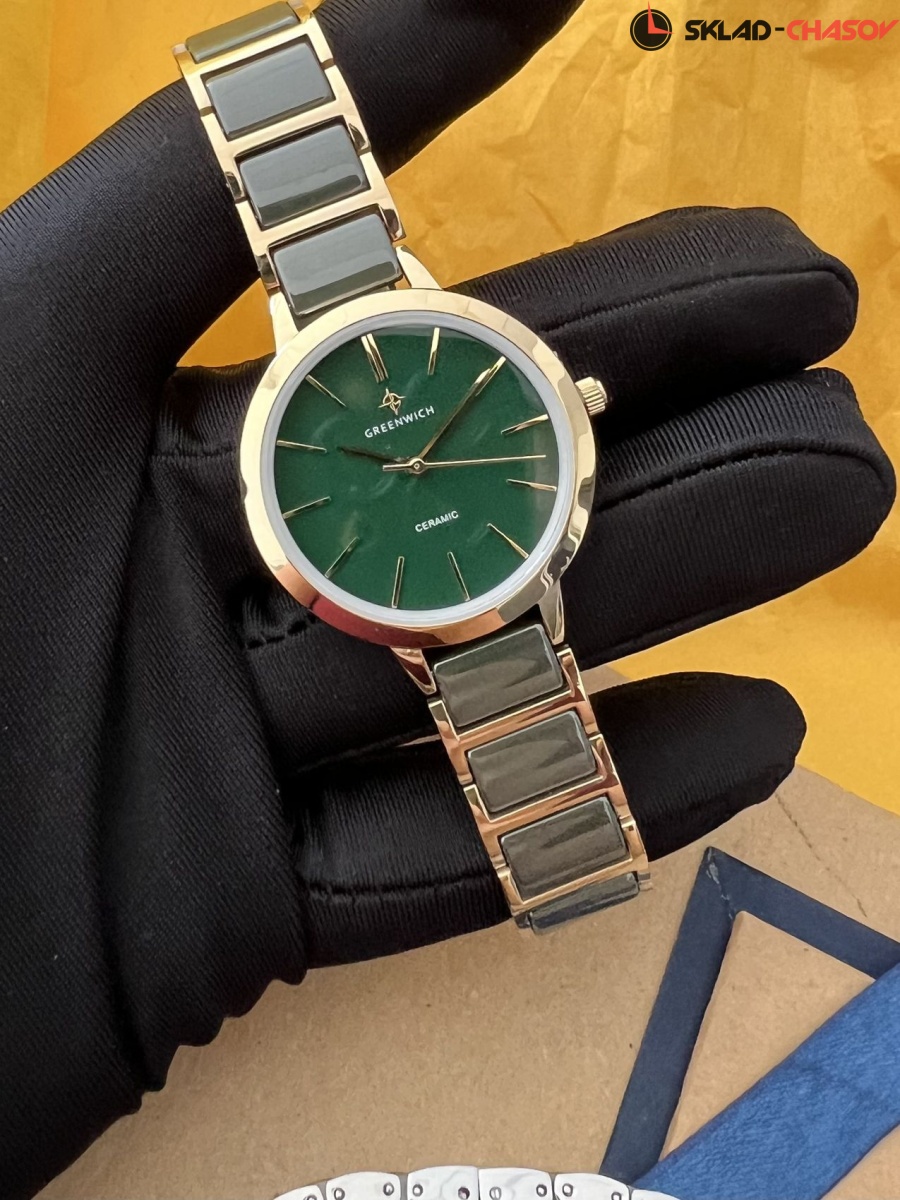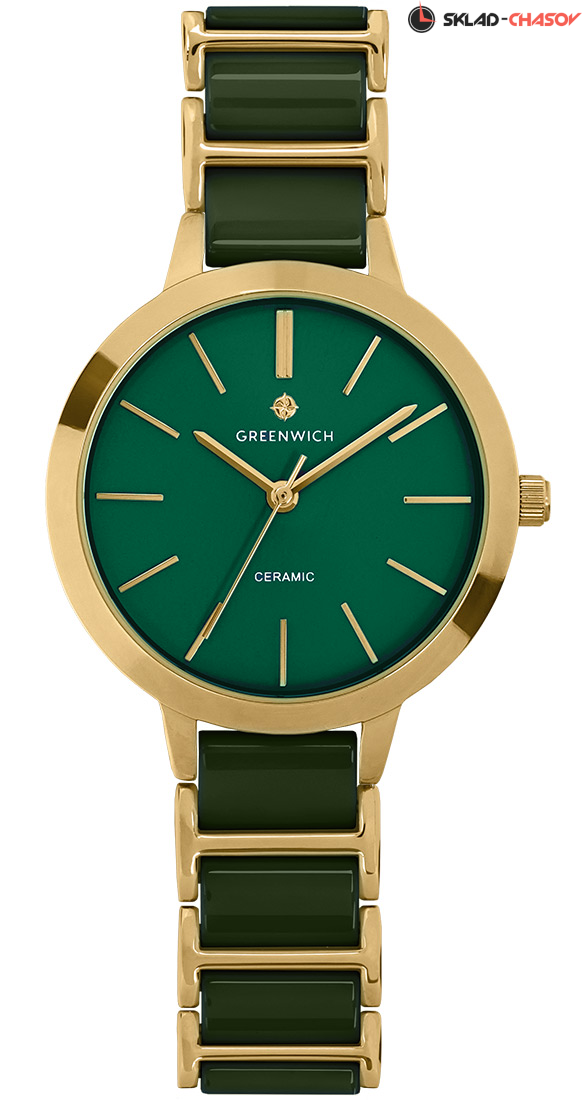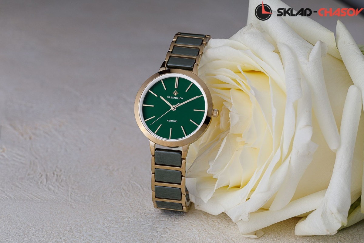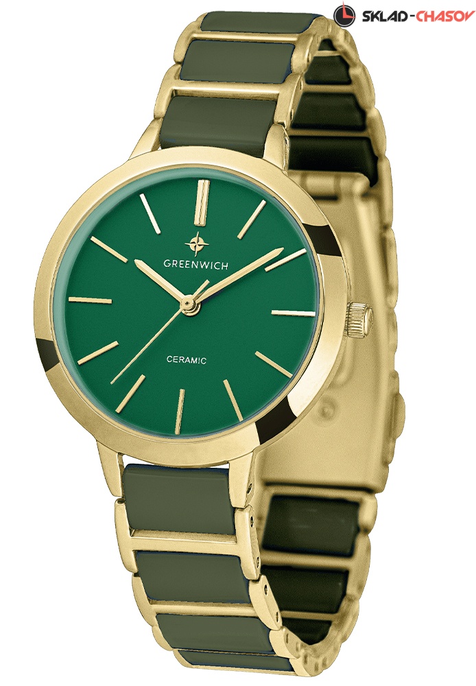 Лаконичные часы серии Fortune оснащены круглым корпусом диаметром 32 мм, сделанным из гипоаллергенной нержавеющей стали с PVD-покрытием из желтого золота. На матовом циферблате хорошо читаются полированные риски и стрелки часов, минут и секунд – они контрастно выделяются на темно-зеленом фоне. За точный ход стрелок отвечает кварцевый механизм Miyota. Звенья изящного браслета сделаны из высокотехнологичной керамики темно-зеленого цвета. Часы из этого современного материала удобно носить в любую погоду: керамика быстро нагревается до комфортной температуры тела. А ее естественный блеск позволит надолго сохранить первоначальный вид часов. Раскладывающаяся застежка выполнена из нержавеющей стали: она надежно удерживает аксессуар на запястье.