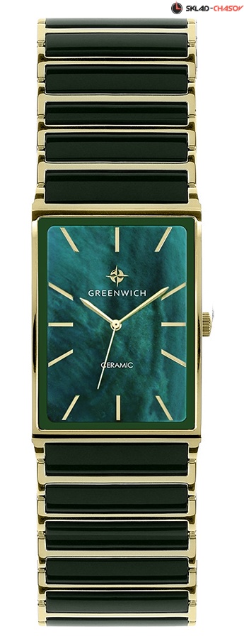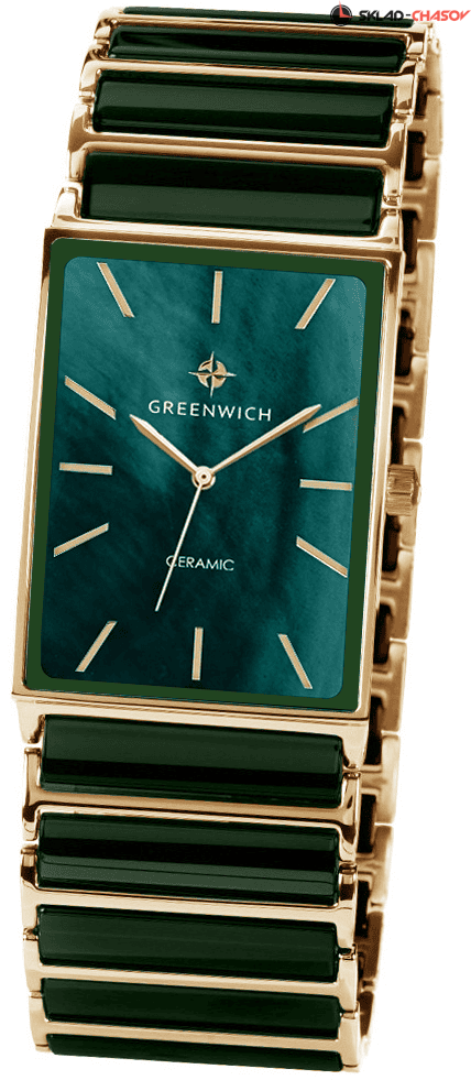 Корпус из нержавеющей стали выполнен в форме прямоугольника — стильное решение для аксессуара на каждый день, который украсит даже самое изящное запястье. Сталь декорирована PVD-покрытием из желтого золота. Риски и стрелки на темно-зеленом циферблате хорошо читаются и позволяют определить время с точностью до секунды. Стальные звенья браслета эффектно сочетаются со звеньями из высокотехнологичной керамики. Застежка-клипса с двумя боковыми кнопками, удобными в использовании, декорирована логотипом бренда. На задней крышке часов — гравировка в виде корабля, на всех парусах несущегося на встречу приключениям.