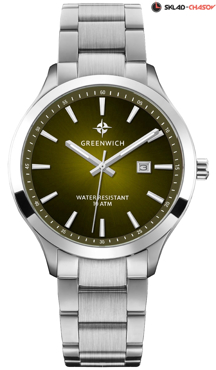 Мужские часы серии Helm – одна из самых популярных моделей марки Greenwich. В часах установлен надежный японский механизм. Корпус часов изготовлен из нержавеющей гипоаллергенной стали. Посередине боковой части корпуса выполнена специальная полировка – вертикальное матирование, что визуально делает корпус тоньше. Размер корпуса 42 мм. Циферблат цвета хаки с градиентом смотрится глубоким и объемным, благодаря «колодцу» по внутреннему краю с нанесенной секундной разметкой. Полировка на циферблате выполнена в стиле солнечных лучей. Индексы часов изготовлены вручную в виде трапеций и закреплены на двух штифтах. На часовую, минутную стрелки и индексы нанесено люминесцентное покрытие, что позволяет определять время в темноте. Часовая и минутная стрелки имеют мечеобразную форму. Это делает их объемными и хорошо читаемыми. Циферблат надежно защищен минеральным стеклом. Водонепроницаемость часов – 10 АТМ, что позволяет заниматься в них водными видами спорта. Завинчивающаяся задняя крышка обеспечивает данный уровень защиты от воды. На часах установлен литой браслет. Застежка с фиксатором защищает часы от случайного падения. Логотип марки – изображение «розы ветров» - символизирует удачу и новые открытия. Он расположен на циферблате и заводной головке. Задняя крышка часов украшена изображениями «розы ветров» и корабля, который является символом марки Greenwich.