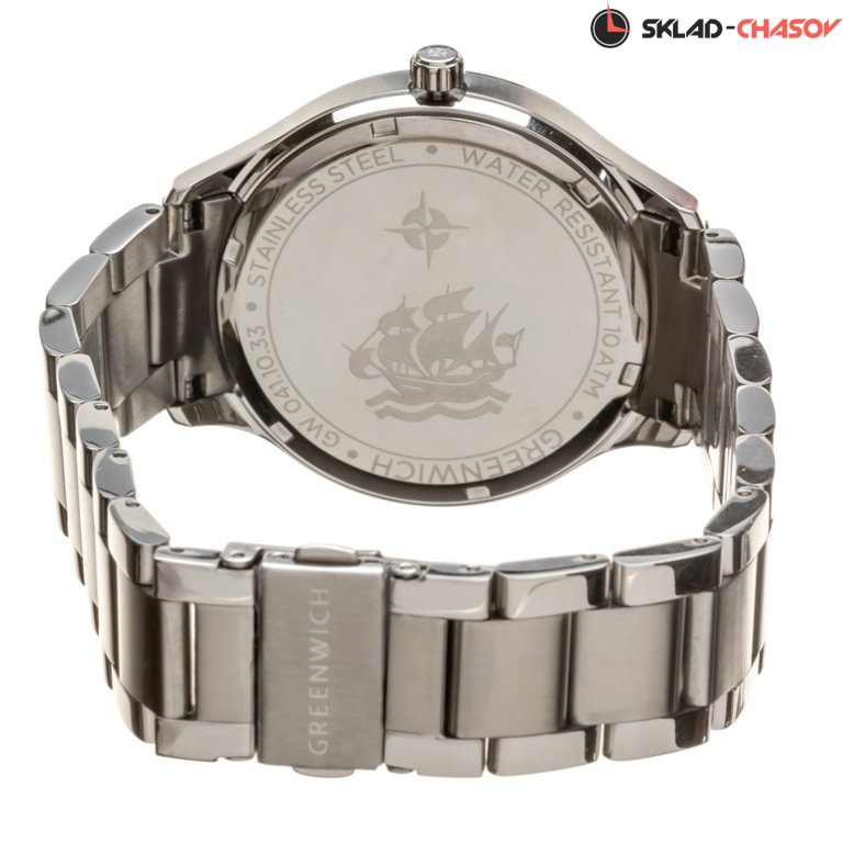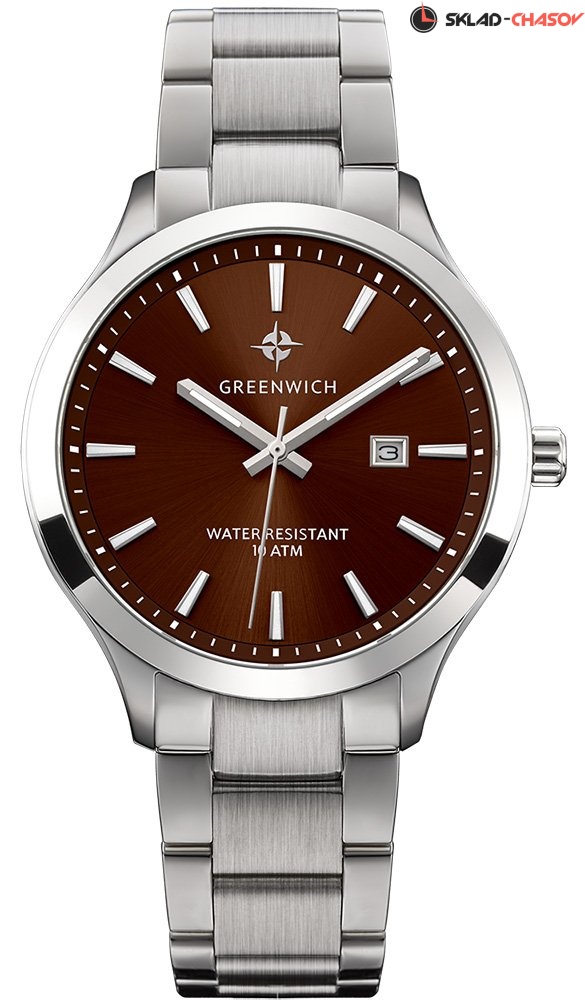 Мужские часы серии Helm – одна из самых популярных моделей марки Greenwich. В часах установлен надежный японский механизм. Корпус часов изготовлен из нержавеющей гипоаллергенной стали. Посередине боковой части корпуса выполнена специальная полировка – вертикальное матирование, что визуально делает корпус тоньше. Размер корпуса 42 мм. Коричневый циферблат смотрится глубоким и объемным, благодаря «колодцу» по внутреннему краю с нанесенной секундной разметкой. Полировка на циферблате выполнена в стиле солнечных лучей. Индексы часов изготовлены вручную в виде трапеций и закреплены на двух штифтах. На часовую, минутную стрелки и индексы нанесено люминесцентное покрытие, что позволяет определять время в темноте. Часовая и минутная стрелки имеют мечеобразную форму. Это делает их объемными и хорошо читаемыми. Циферблат надежно защищен минеральным стеклом. Водонепроницаемость часов – 10 АТМ, что позволяет заниматься в них водными видами спорта. Завинчивающаяся задняя крышка обеспечивает данный уровень защиты от воды. На часах установлен литой браслет. Застежка с фиксатором защищает часы от случайного падения. Логотип марки – изображение «розы ветров» - символизирует удачу и новые открытия. Он расположен на циферблате и заводной головке. Задняя крышка часов украшена изображениями «розы ветров» и корабля, который является символом марки Greenwich.