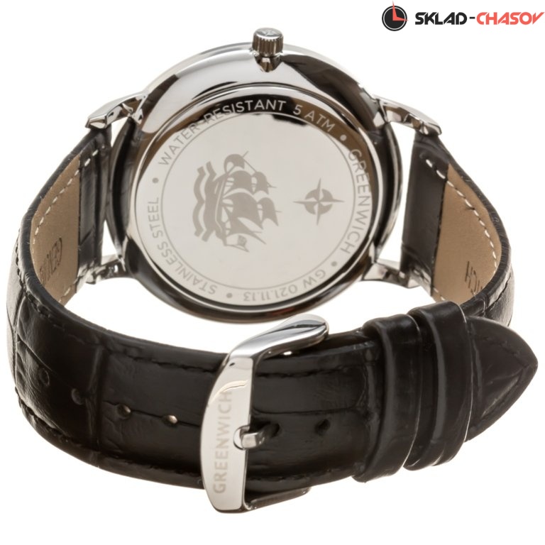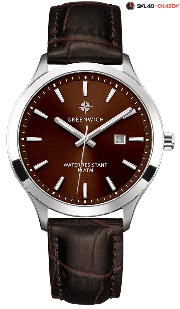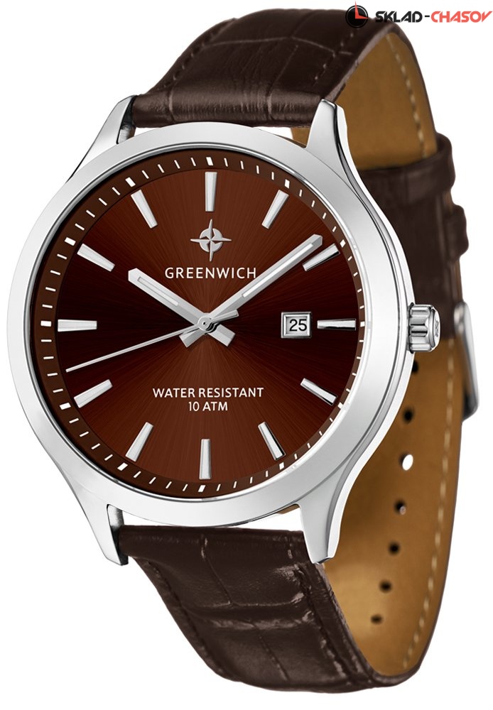 Мужские часы серии Helm – одна из самых популярных моделей марки Greenwich. В часах установлен надежный японский механизм. Корпус часов изготовлен из нержавеющей гипоаллергенной стали. Посередине боковой части корпуса выполнена специальная полировка – вертикальное матирование, что визуально делает корпус тоньше. Размер корпуса 42 мм. Коричневый циферблат смотрится глубоким и объемным, благодаря «колодцу» по внутреннему краю с нанесенной секундной разметкой. Полировка на циферблате выполнена в стиле солнечных лучей. Индексы часов изготовлены вручную в виде трапеций и закреплены на двух штифтах. На часовую, минутную стрелки и индексы нанесено люминесцентное покрытие, что позволяет определять время в темноте. Часовая и минутная стрелки имеют мечеобразную форму. Это делает их объемными и хорошо читаемыми. Циферблат надежно защищен минеральным стеклом. Водонепроницаемость часов – 10 АТМ, что позволяет заниматься в них водными видами спорта. Завинчивающаяся задняя крышка обеспечивает данный уровень защиты от воды. На часах установлен коричневый ремешок из натуральной кожи. Логотип марки – изображение «розы ветров» - символизирует удачу и новые открытия. Он расположен на циферблате, заводной головке и внутренней части ремешка. Задняя крышка часов украшена изображениями «розы ветров» и корабля, который является символом марки Greenwich.