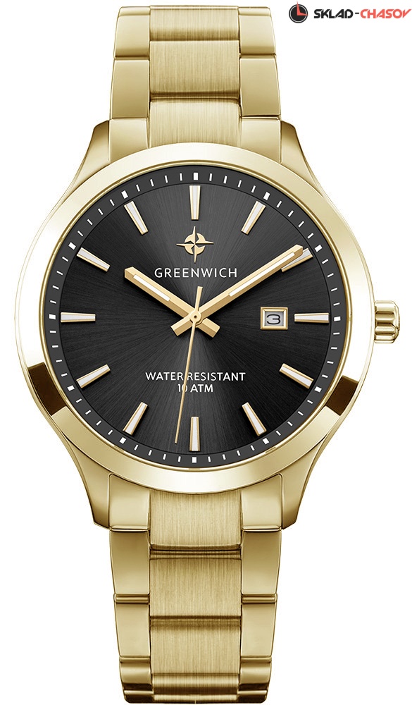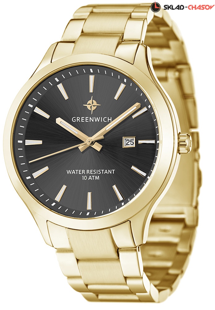 Мужские часы серии Helm – одна из самых популярных моделей марки Greenwich. В часах установлен надежный японский механизм. Корпус часов изготовлен из нержавеющей гипоаллергенной стали. Посередине боковой части корпуса выполнена специальная полировка – вертикальное матирование, что визуально делает корпус тоньше. Размер корпуса 42 мм. Серый циферблат смотрится глубоким и объемным, благодаря «колодцу» по внутреннему краю с нанесенной секундной разметкой. Полировка на циферблате выполнена в стиле солнечных лучей. Индексы часов изготовлены вручную в виде трапеций и закреплены на двух штифтах. На часовую, минутную стрелки и индексы нанесено люминесцентное покрытие, что позволяет определять время в темноте. Часовая и минутная стрелки имеют мечеобразную форму. Это делает их объемными и хорошо читаемыми. Циферблат надежно защищен минеральным стеклом. Водонепроницаемость часов – 10 АТМ, что позволяет заниматься в них водными видами спорта. Завинчивающаяся задняя крышка обеспечивает данный уровень защиты от воды. На часах установлен литой браслет. Застежка с фиксатором защищает часы от случайного падения. Логотип марки – изображение «розы ветров» - символизирует удачу и новые открытия. Он расположен на циферблате и заводной головке. Задняя крышка часов украшена изображениями «розы ветров» и корабля, который является символом марки Greenwich.