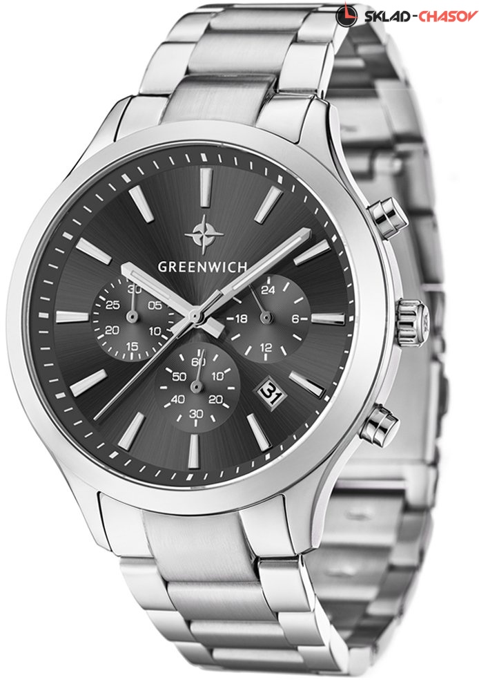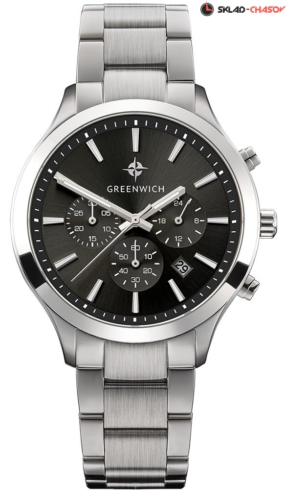 Мужской хронограф серии Skipper – это сочетание повседневного стиля и спортивной функциональности. В часах установлен надежный японский механизм с функциями: часы, минуты, секунды, дата, 24-х часовой индикатор, хронограф. Корпус часов изготовлен из нержавеющей гипоаллергенной стали. Посередине боковой части корпуса выполнена специальная полировка – вертикальное матирование, что визуально делает корпус тоньше. Размер корпуса 42 мм. Черный циферблат смотрится глубоким и объемным, благодаря «колодцу» по внутреннему краю с нанесенной секундной разметкой. Полировка на циферблате выполнена в стиле солнечных лучей. Индикаторы украшены гравировкой в виде концентрических колец и хорошо выделяются на фоне циферблата. Индексы часов изготовлены вручную в виде трапеций и закреплены на двух штифтах. На часовую, минутную стрелки и индексы нанесено люминесцентное покрытие, что позволяет определять время в темноте. Часовая и минутная стрелки имеют мечеобразную форму. Это делает их объемными и хорошо читаемыми. Циферблат надежно защищен минеральным стеклом. Водонепроницаемость часов – 10 АТМ, что позволяет заниматься в них водными видами спорта. Завинчивающаяся задняя крышка обеспечивает данный уровень защиты от воды. На часах установлен литой браслет из нержавеющей стали. Застежка с фиксатором защищает часы от случайного падения. Логотип марки – изображение «розы ветров» - символизирует удачу и новые открытия. Он расположен на циферблате и заводной головке. Задняя крышка часов украшена изображениями «розы ветров» и корабля, который является символом марки Greenwich.