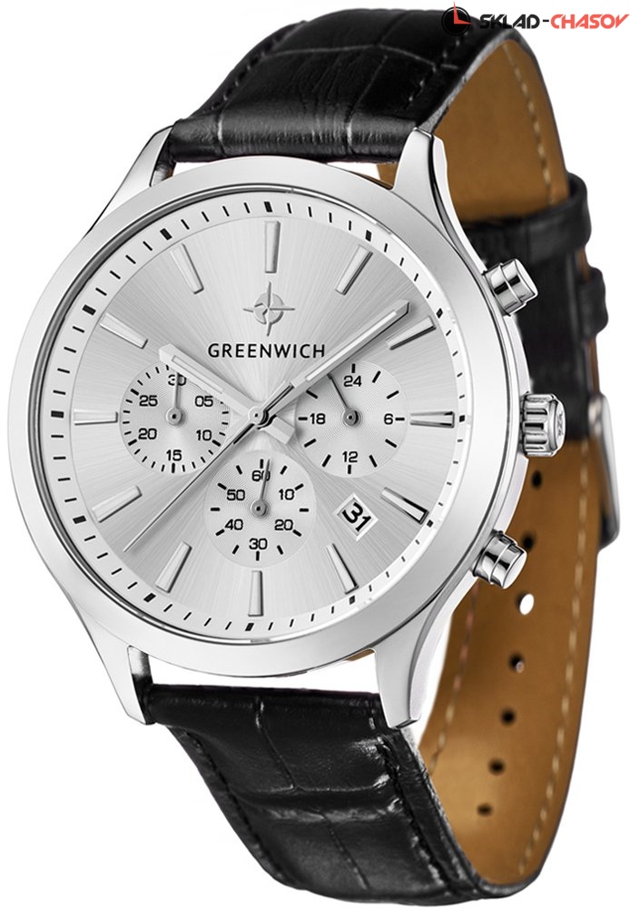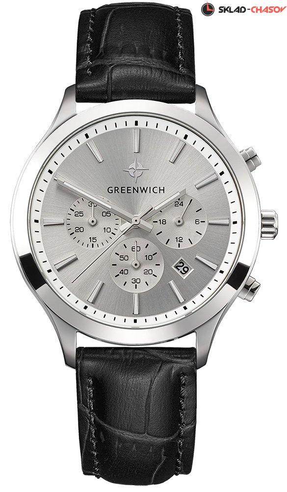 Мужской хронограф серии Skipper – это сочетание повседневного стиля и спортивной функциональности. В часах установлен надежный японский механизм с функциями: часы, минуты, секунды, дата, 24-х часовой индикатор, хронограф. Корпус часов изготовлен из нержавеющей гипоаллергенной стали. Посередине боковой части корпуса выполнена специальная полировка – вертикальное матирование, что визуально делает корпус тоньше. Размер корпуса 42 мм. Стальной циферблат смотрится глубоким и объемным, благодаря «колодцу» по внутреннему краю с нанесенной секундной разметкой. Полировка на циферблате выполнена в стиле солнечных лучей. Индикаторы украшены гравировкой в виде концентрических колец и хорошо выделяются на фоне циферблата. Индексы часов изготовлены вручную в виде трапеций и закреплены на двух штифтах. На часовую, минутную стрелки и индексы нанесено люминесцентное покрытие, что позволяет определять время в темноте. Часовая и минутная стрелки имеют мечеобразную форму. Это делает их объемными и хорошо читаемыми. Циферблат надежно защищен минеральным стеклом. Водонепроницаемость часов – 10 АТМ, что позволяет заниматься в них водными видами спорта. Завинчивающаяся задняя крышка обеспечивает данный уровень защиты от воды. На часах установлен черный ремешок из натуральной кожи. Логотип марки – изображение «розы ветров» - символизирует удачу и новые открытия. Он расположен на циферблате, заводной головке и внутренней части ремешка. Задняя крышка часов украшена изображениями «розы ветров» и корабля, который является символом марки Greenwich.
