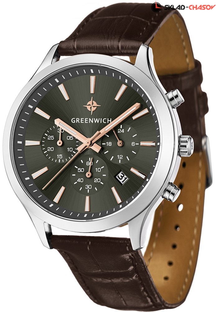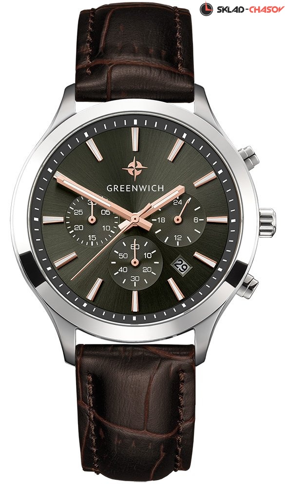 Мужской хронограф серии Skipper – это сочетание повседневного стиля и спортивной функциональности. В часах установлен надежный японский механизм с функциями: часы, минуты, секунды, дата, 24-х часовой индикатор, хронограф. Корпус часов изготовлен из нержавеющей гипоаллергенной стали. Посередине боковой части корпуса выполнена специальная полировка – вертикальное матирование, что визуально делает корпус тоньше. Размер корпуса 42 мм. Серый циферблат смотрится глубоким и объемным, благодаря «колодцу» по внутреннему краю с нанесенной секундной разметкой. Полировка на циферблате выполнена в стиле солнечных лучей. Индикаторы украшены гравировкой в виде концентрических колец и хорошо выделяются на фоне циферблата. Индексы часов изготовлены вручную в виде трапеций и закреплены на двух штифтах. На часовую, минутную стрелки и индексы нанесено люминесцентное покрытие, что позволяет определять время в темноте. Часовая и минутная стрелки имеют мечеобразную форму. Это делает их объемными и хорошо читаемыми. Циферблат надежно защищен минеральным стеклом. Водонепроницаемость часов – 10 АТМ, что позволяет заниматься в них водными видами спорта. Завинчивающаяся задняя крышка обеспечивает данный уровень защиты от воды. На часах установлен коричневый ремешок из натуральной кожи. Логотип марки – изображение «розы ветров» - символизирует удачу и новые открытия. Он расположен на циферблате, заводной головке и внутренней части ремешка. Задняя крышка часов украшена изображениями «розы ветров» и корабля, который является символом марки Greenwich.