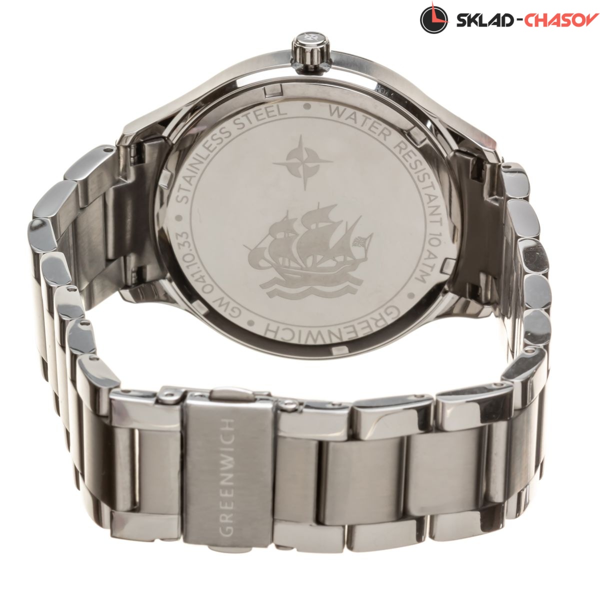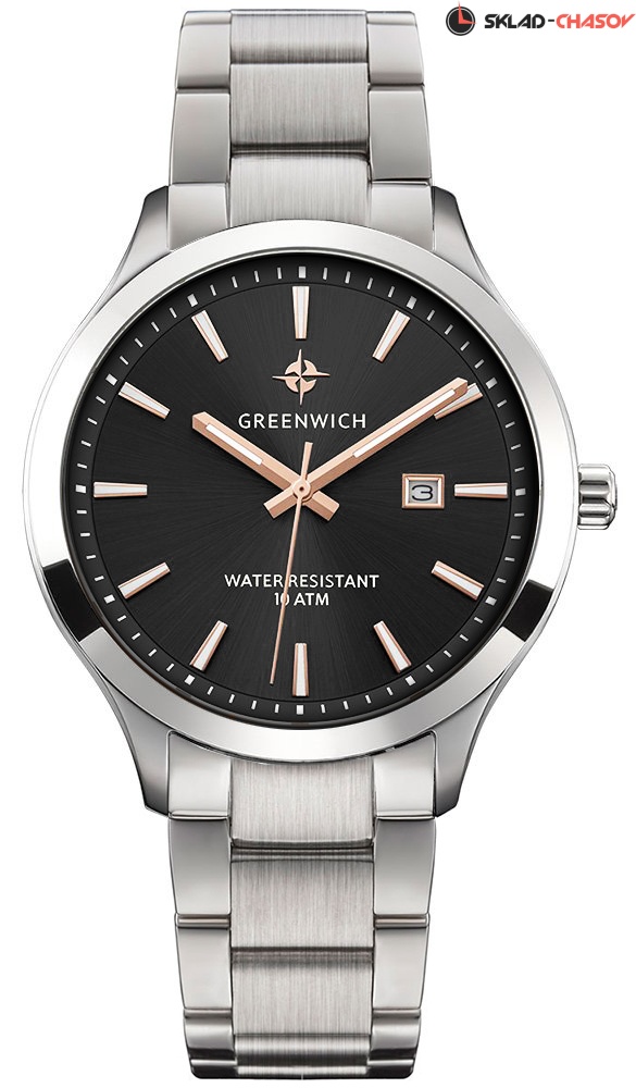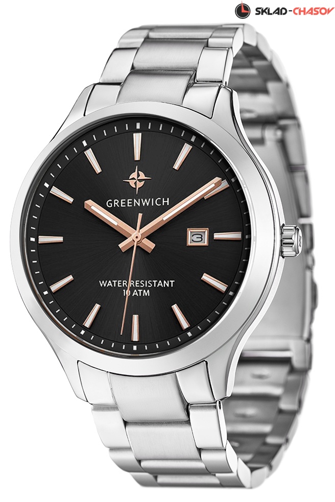 Массивный корпус часов с полированным безелем сделан из гипоаллергенной нержавеющей стали. Она обладает антимагнитным эффектом, повышая, таким образом, точность работы кварцевого механизма. Полированный циферблат черного цвета вмещает крупные часовую и минутную стрелки с покрытием из розового золота. Хорошо читается и секундная стрелка, которая отсчитывает секунды по маркированному кругу. Индикатор в положении «3 часа» показывает дату. Надежный японский механизм обеспечивает бесперебойную работу. О качестве часов говорит повышенная водостойкость — 10 атмосфер. Модель дополняет браслет из нержавеющей стали с раскладывающейся застежкой. Бренд Greenwich отличается вниманием к деталям. На заводной головке и задней крышке расположился логотип: стилизованное изображение розы ветров. На задней крышке — гравировка корабля, плывущего навстречу приключениям.