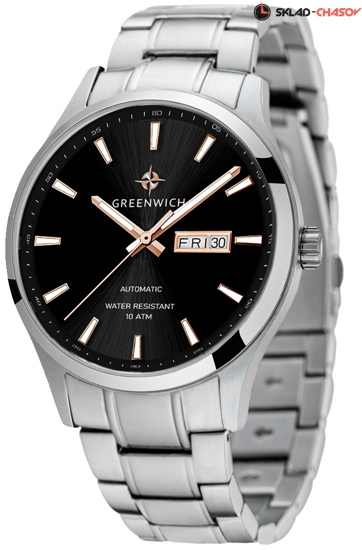 Часы дополняет стальной браслет с надежной застежкой-клипсой. Автоматические часы Greenwich хорошо подходят для того, чтобы носить их каждый день. Их универсальный дизайн сочетается практически с любыми предметами гардероба, а механизм заводится, находясь на запястье владельца.