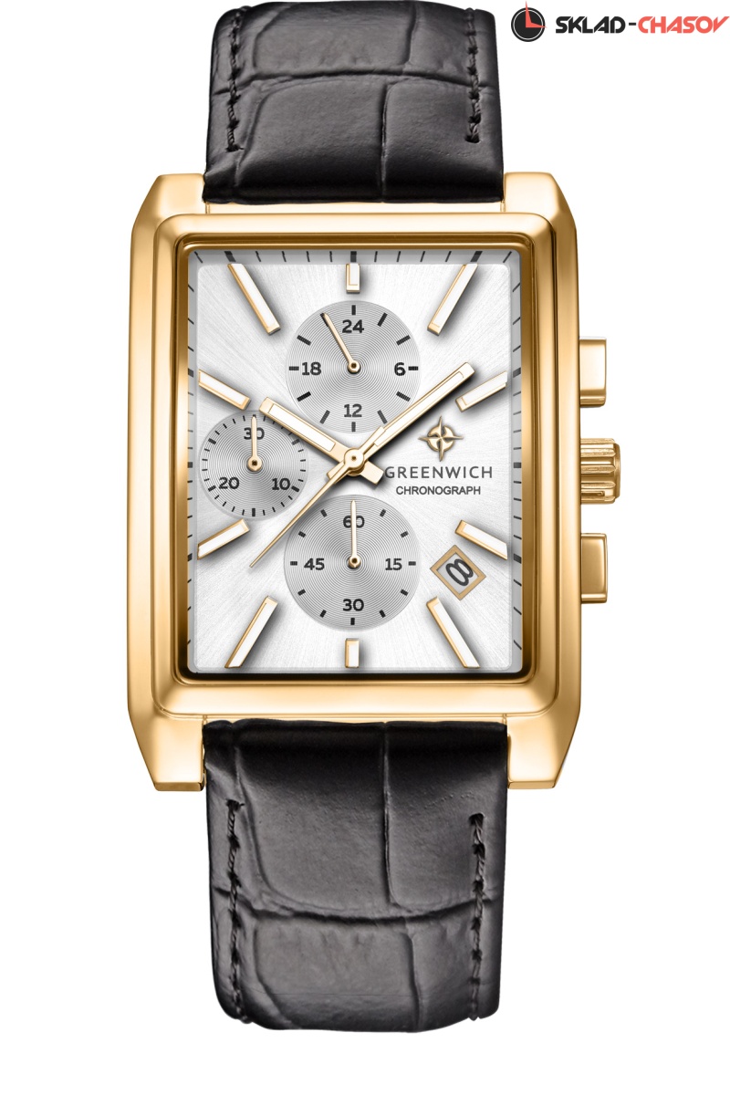 Кварцевый механизм часов серии Galeon Chrono позволяет точно определять время, дату и пользоваться функциями хронографа: засекать время в минутах и секундах. Плюс к этому, на белом циферблате модели есть индикатор 24-х часов (демонстрирует время в формате 24-х часов). Защищает механизм корпус прямоугольной формы из нержавеющей стали с PVD-покрытием из желтого золота. Стрелки и риски светятся в темноте — они покрыты специальным люминесцентным составом. Ремешок часов выполнен из натуральной кожи черного цвета, прошивка продлевает срок его службы. Серия Galeon Chrono - это сочетание спортивного функционала и классической элегантности. Часы хорошо дополнят тот образ, который вы выберете сегодня, от классического костюма до расслабленного casual.