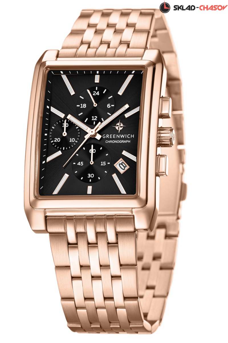Кварцевый механизм часов серии Galeon Chrono позволяет точно определять время, дату и пользоваться функциями хронографа: засекать время в минутах и секундах. Плюс к этому, на черном циферблате модели есть индикатор 24-х часов (демонстрирует время в формате 24-х часов). Защищает механизм корпус прямоугольной формы из нержавеющей стали с PVD-покрытием из розового золота. Стрелки и риски светятся в темноте — они покрыты специальным люминесцентным составом. Браслет часов, как и застежка-клипса, выполнен из нержавеющей стали, украшением которой служат полировка и PVD-покрытие из розового золота. Серия Galeon Chrono - это сочетание спортивного функционала и классической элегантности. Часы хорошо дополнят тот образ, который вы выберете сегодня, от классического костюма до расслабленного casual.