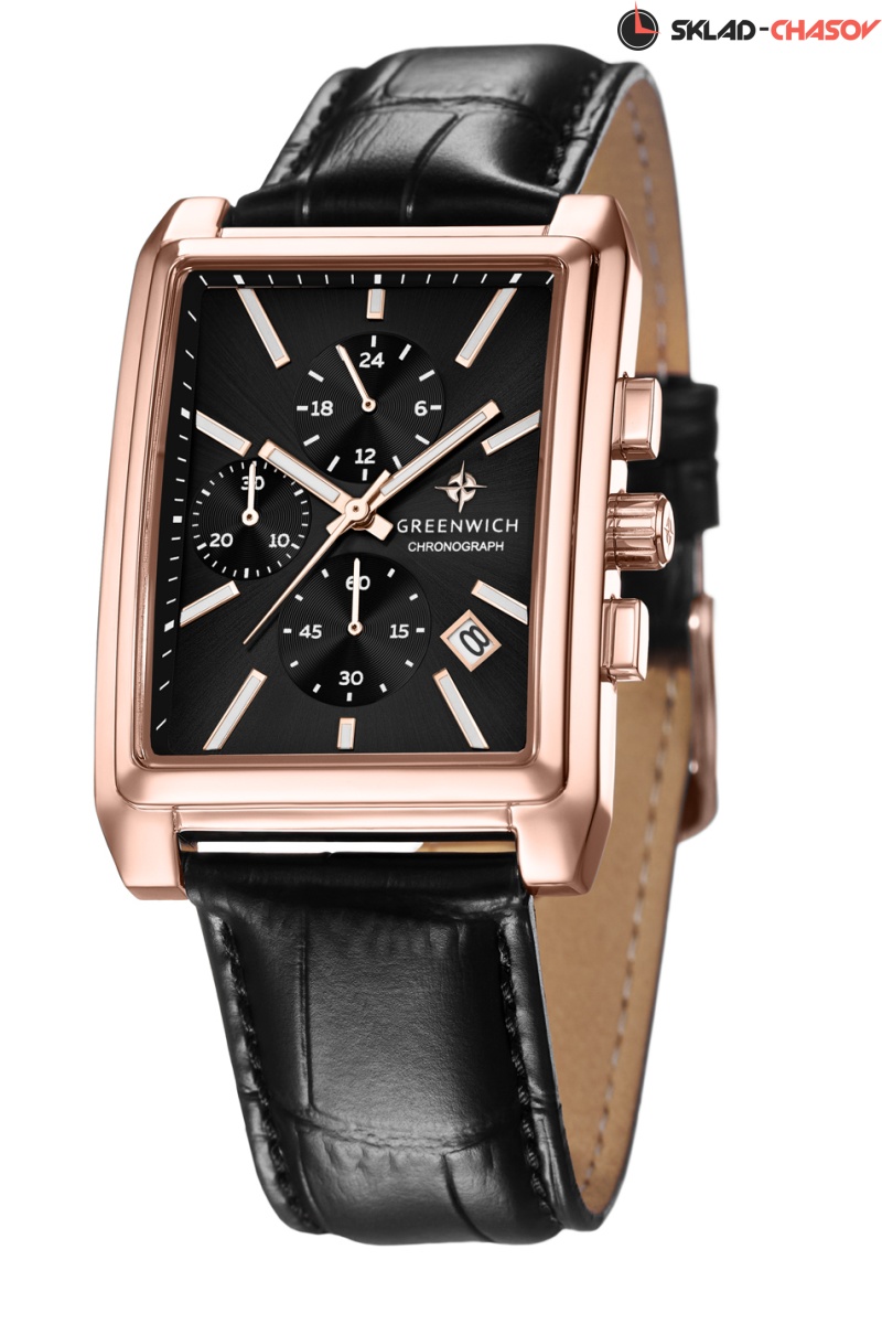 Кварцевый механизм часов серии Galeon Chrono позволяет точно определять время, дату и пользоваться функциями хронографа: засекать время в минутах и секундах. Плюс к этому, на черном циферблате модели есть индикатор 24-х часов (демонстрирует время в формате 24-х часов). Защищает механизм корпус прямоугольной формы из нержавеющей стали с PVD-покрытием из розового золота. Стрелки и риски светятся в темноте — они покрыты специальным люминесцентным составом. Ремешок часов выполнен из натуральной кожи черного цвета, прошивка продлевает срок его службы. Серия Galeon Chrono - это сочетание спортивного функционала и классической элегантности. Часы хорошо дополнят тот образ, который вы выберете сегодня, от классического костюма до расслабленного casual.