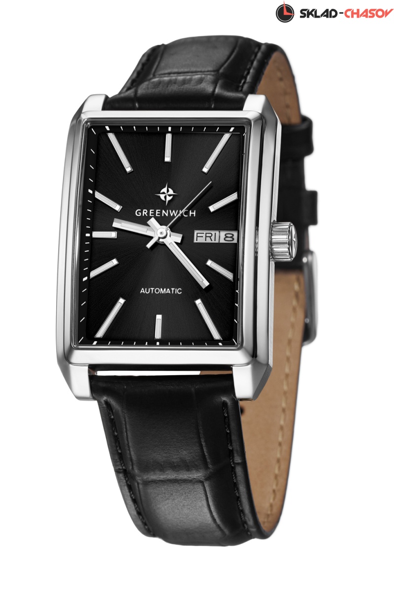 Новое прочтение классических часов от Greenwich: часы в прямоугольном корпусе со скошенными углами серии Caravel. В качестве материала для корпуса была выбрана гипоаллергенная нержавеющая сталь. За движение стрелок, дисков даты и дня недели на черном циферблате отвечает механизм с функцией автоподзавода. За его работой можно наблюдать через прозрачное окошко на задней крышке часов. Стрелки и риски светятся в темноте — они покрыты люминесцентным составом. Ремешок часов выполнен из натуральной кожи черного цвета с прошивкой. Механические часы Caravel подходят для ежедневного использования, тем более, что в таком режиме ротор будет заводить пружину механизма от обычных движений руки, без необходимости завода с помощью заводной головки.