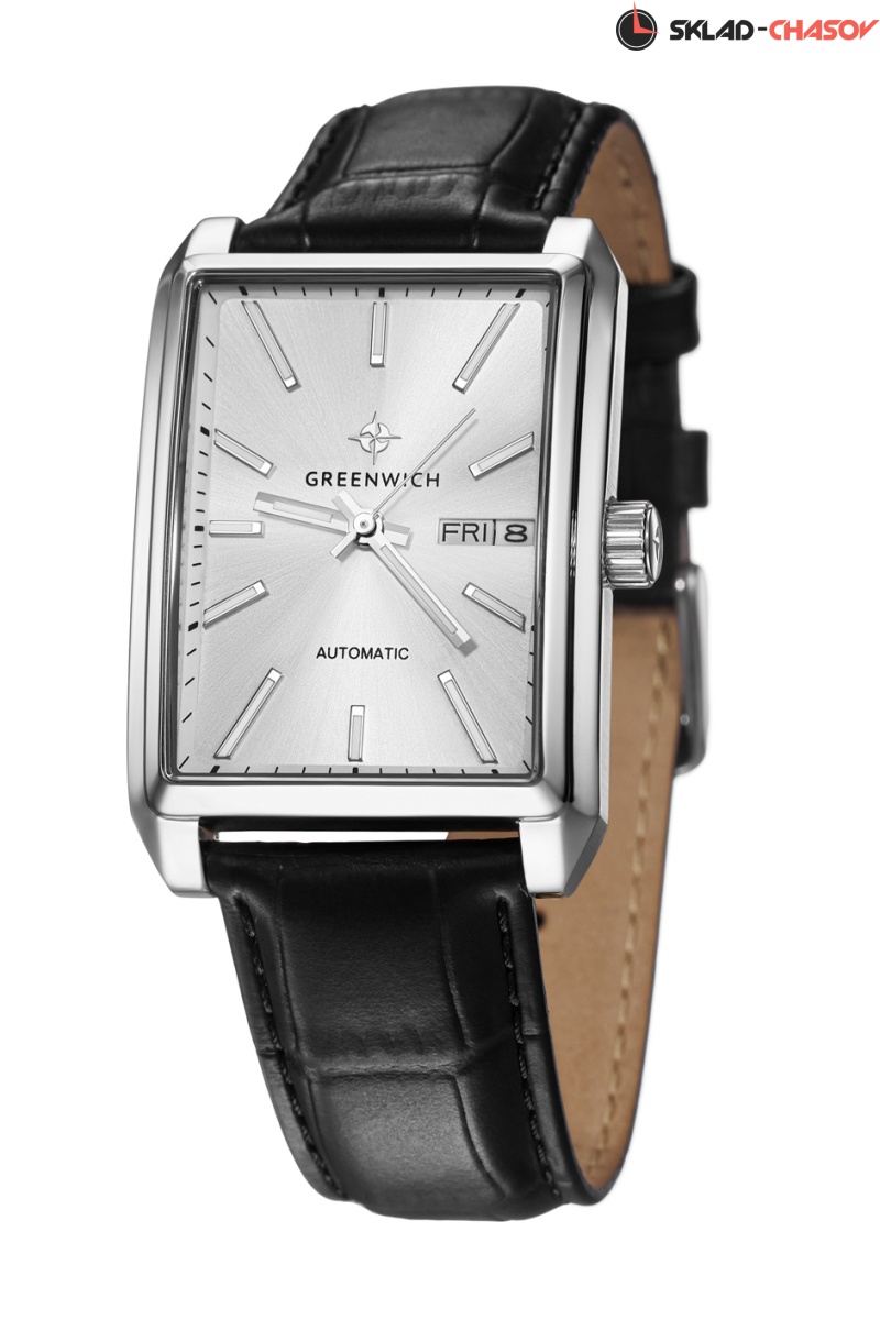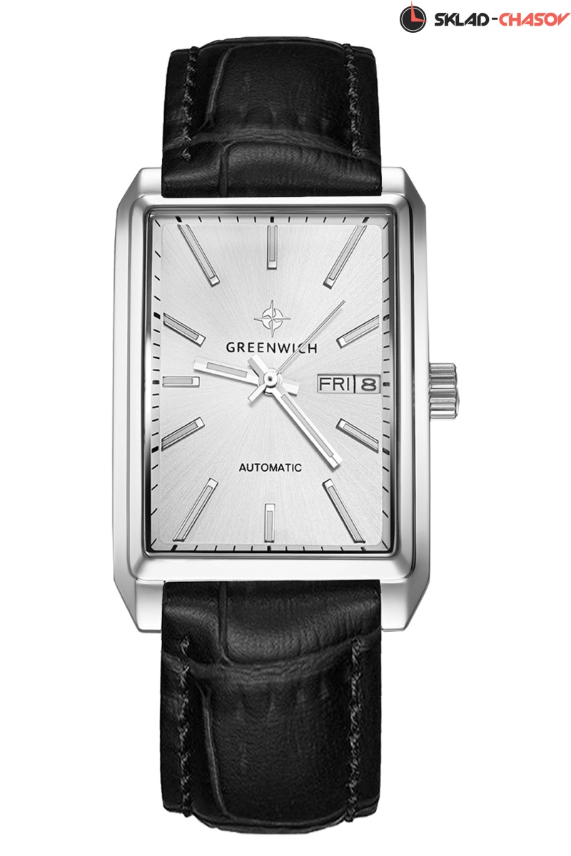 Новое прочтение классических часов от Greenwich: часы в прямоугольном корпусе со скошенными углами серии Caravel. В качестве материала для корпуса была выбрана гипоаллергенная нержавеющая сталь. За движение стрелок, дисков даты и дня недели на белом циферблате отвечает механизм с функцией автоподзавода. За его работой можно наблюдать через прозрачное окошко на задней крышке часов. Стрелки и риски светятся в темноте — они покрыты люминесцентным составом. Ремешок часов выполнен из натуральной кожи черного цвета с прошивкой. Механические часы Caravel подходят для ежедневного использования, тем более, что в таком режиме ротор будет заводить пружину механизма от обычных движений руки, без необходимости завода с помощью заводной головки.