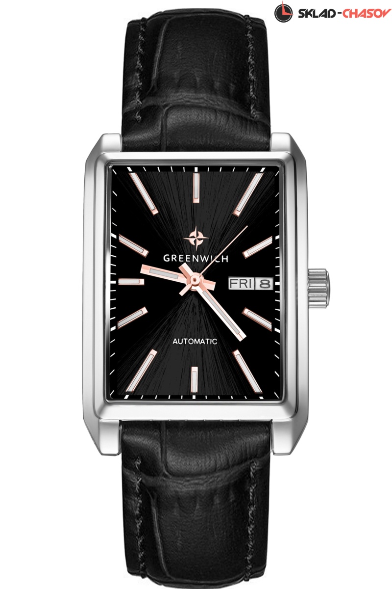 Новое прочтение классических часов от Greenwich: часы в прямоугольном корпусе со скошенными углами серии Caravel. В качестве материала для корпуса была выбрана гипоаллергенная нержавеющая сталь. За движение стрелок, дисков даты и дня недели на черном циферблате отвечает механизм с функцией автоподзавода. За его работой можно наблюдать через прозрачное окошко на задней крышке часов. Стрелки и риски светятся в темноте — они покрыты люминесцентным составом. Ремешок часов выполнен из натуральной кожи черного цвета с прошивкой. Механические часы Caravel подходят для ежедневного использования, тем более, что в таком режиме ротор будет заводить пружину механизма от обычных движений руки, без необходимости завода с помощью заводной головки.