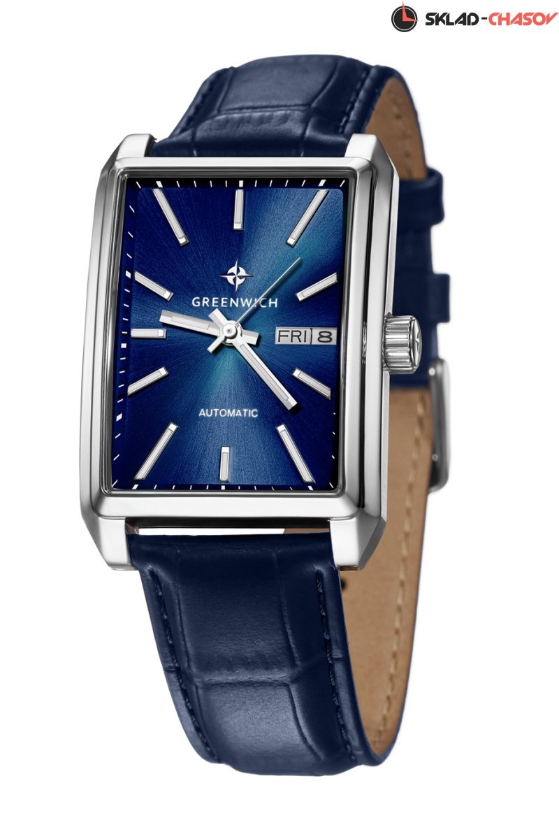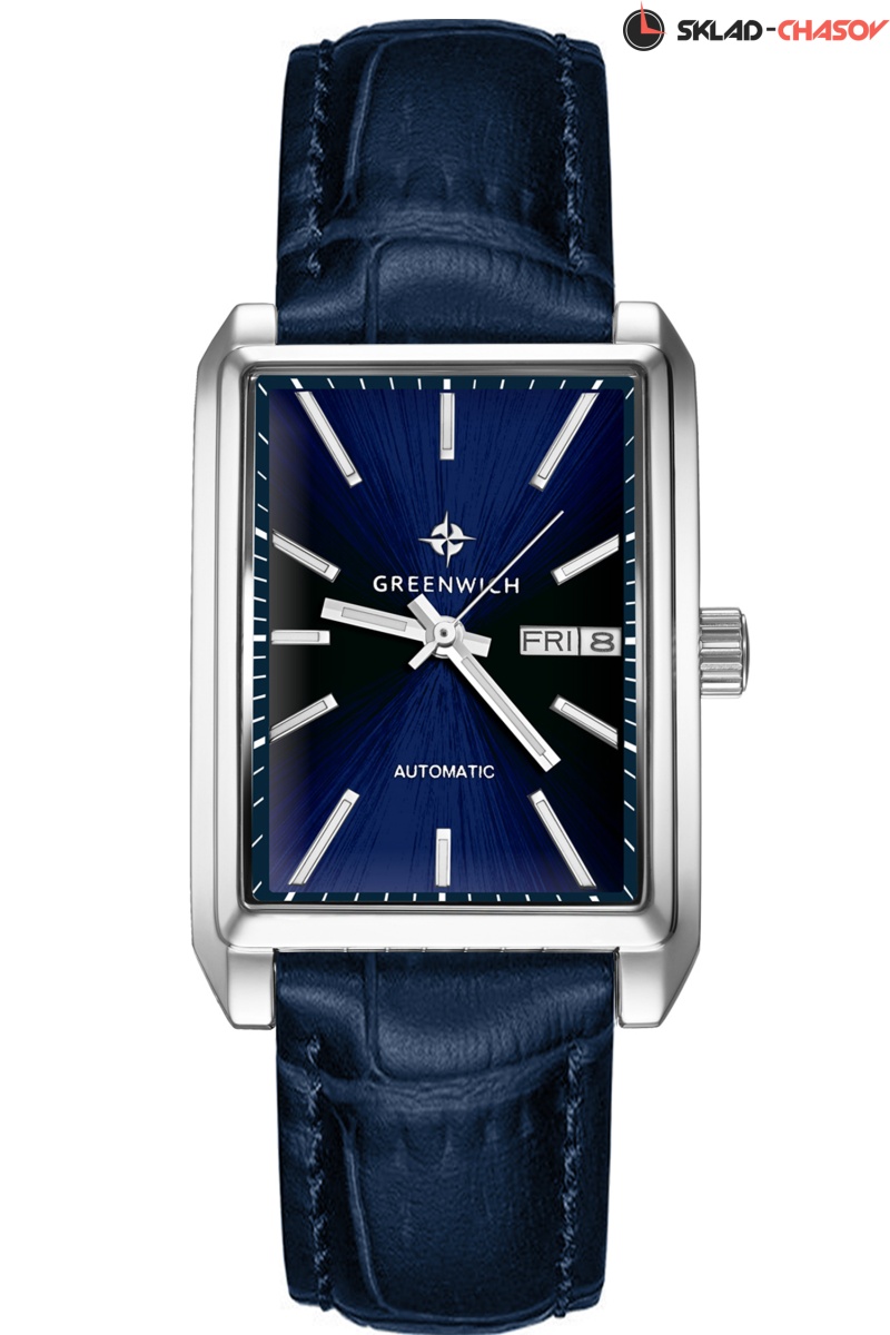 Новое прочтение классических часов от Greenwich: часы в прямоугольном корпусе со скошенными углами серии Caravel. В качестве материала для корпуса была выбрана гипоаллергенная нержавеющая сталь. За движение стрелок, дисков даты и дня недели на синем циферблате отвечает механизм с функцией автоподзавода. За его работой можно наблюдать через прозрачное окошко на задней крышке часов. Стрелки и риски светятся в темноте — они покрыты люминесцентным составом. Ремешок часов выполнен из натуральной кожи синего цвета с прошивкой. Механические часы Caravel подходят для ежедневного использования, тем более, что в таком режиме ротор будет заводить пружину механизма от обычных движений руки, без необходимости завода с помощью заводной головки.
