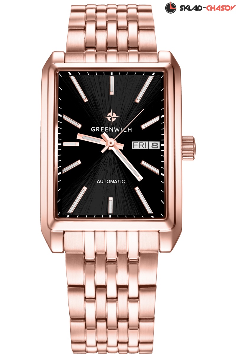 Новое прочтение классических часов от Greenwich: часы в прямоугольном корпусе со скошенными углами серии Caravel. В качестве основного материала была выбрана гипоаллергенная нержавеющая сталь с PVD-покрытием из розового золота, из нее сделаны корпус и браслет модели. За движение стрелок, дисков даты и дня недели на черном циферблате отвечает механизм с функцией автоподзавода. За его работой можно наблюдать через прозрачное окошко на задней крышке часов. Стрелки и риски светятся в темноте — они покрыты люминесцентным составом. На браслете установлена застежка-клипса, надежная и удобная в использовании. Механические часы Caravel подходят для ежедневного использования, тем более, что в таком режиме ротор будет заводить пружину механизма от обычных движений руки, без необходимости завода с помощью заводной головки.