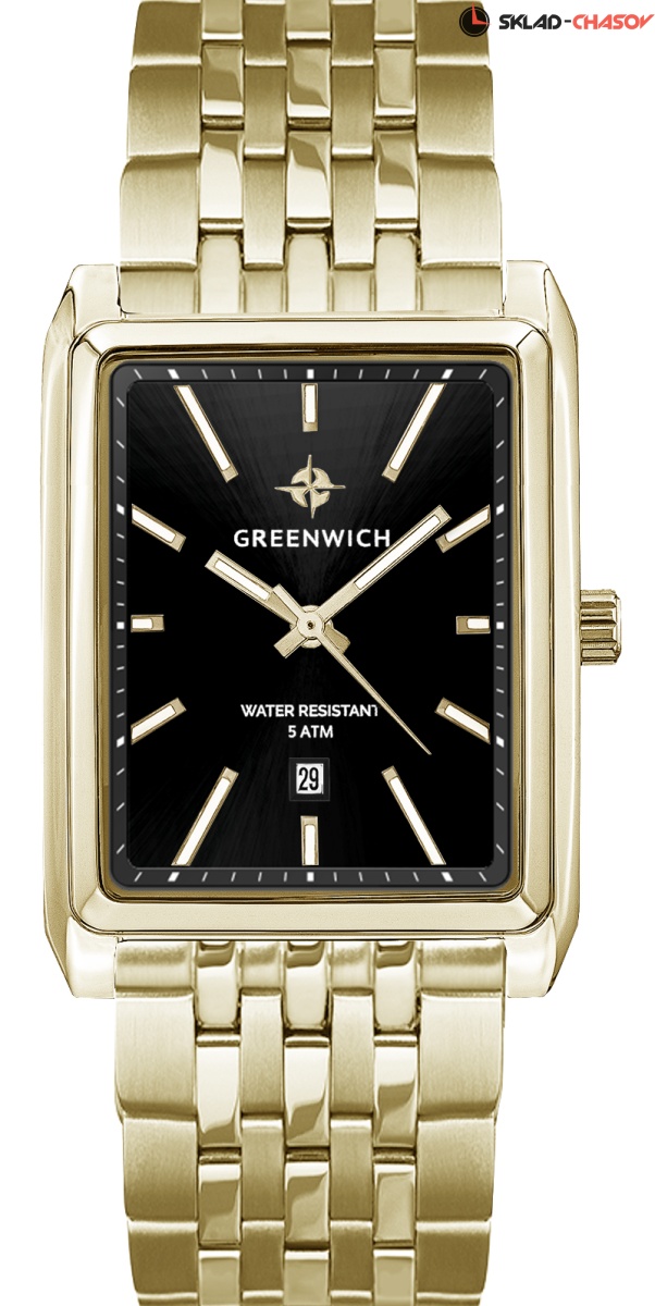 Кварцевый механизм часов серии Galeon скрыт в стильном корпусе прямоугольной формы. Нержавеющая сталь - материал, из которого этот корпус сделан - не вызывает аллергических реакций и подходит для частого контакта с кожей запястья. Крупные стрелки с люминесцентным покрытием движутся по черному циферблату. Окошко даты расположилось в позиции "6 часов". Браслет собран из стальных звеньев, где зеркальная полировка эффектно чередуется с матированием. Застежка-клипса надежно удерживает аксессуар на запястье. Корпус и браслет модели украшает PVD-покрытие из желтого золота. Это не только эффектный способ декора, но и дополнительная защита нержавеющей стали. Часы серии Galeon будут уместны в сочетании с любыми вещами вашего гардероба: от классического костюма до одежды в стиле casual.