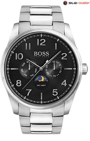 Кварцевый механизм, мультифункция, лунный календарь, корпус из нержавеющей стали, диаметр корпуса 43 мм, минеральное стекло, черный циферблат, браслет из нержавеющей стали. Водозащита 3 АТМ.