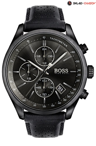 Кварцевый механизм, хронограф, тахиметр, корпус из нержавеющей стали, черное покрытие, диаметр корпуса 44 мм, минеральное стекло, черный циферблат, черный перфорированный ремешок из натуральной кожи. Водозащита 3 АТМ.