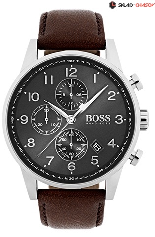 Кварцевый хронограф, корпус из нержавеющей стали, диаметр корпуса 44 мм, минеральное стекло, серый циферблат, коричневый ремешок из натуральной кожи. Водозащита 5 АТМ.