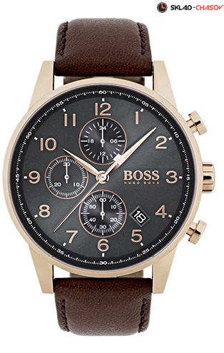 Кварцевый хронограф, корпус из нержавеющей стали, золотистое IP покрытие, диаметр корпуса 44 мм, минеральное стекло, серый циферблат, коричневый ремешок из натуральной кожи. Водозащита 5 АТМ.