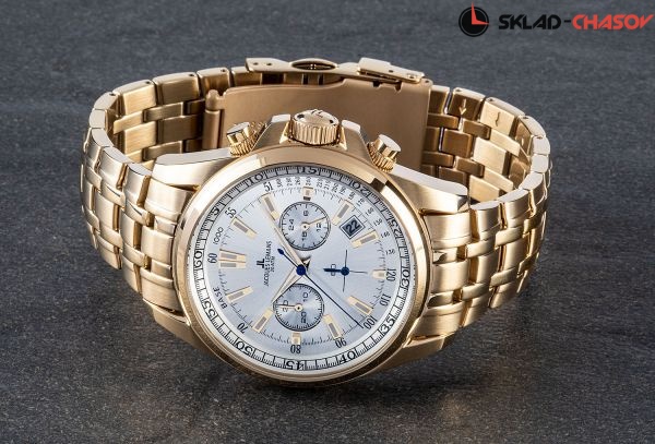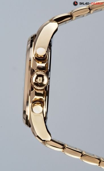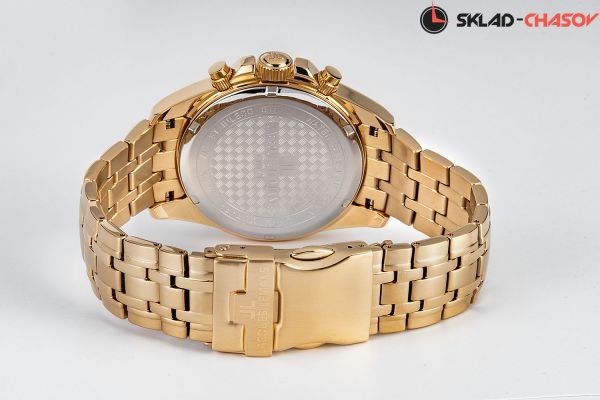 Легендарный хронограф Jacques Lemans с кварцевым механизмом выпускается уже более 20 лет и неизменно пользуется любовью покупателей. Круглый корпус диаметром 44 мм сделан из нержавеющей стали: прочного материала с гипоаллергенными свойствами. Он украшен PVD-покрытием из желтого золота. На полированном стальном циферблате все идеально продумано и сбалансировано: каждая стрелка, каждая цифра или риска хорошо читаются. Здесь расположили 24-часовой индикатор, минутный и секундный накопители, окошко даты, тахиметрическую шкалу и дополнительную шкалу индикации секунд. Центральные часовая и минутная стрелки и риски покрыты люминесцентным составом, благодаря которому время легко определяется даже в темноте. Минеральное стекло Crystex отличается повышенной ударопрочностью. Заводная головка и задняя крышка модели завинчиваются, обеспечивая водостойкость в 20 атмосфер (в часах можно плавать и заниматься снорклингом). На браслет из литых стальных звеньев с PVD-покрытием установлена удобная застежка-клипса. Стильный и надежный хронограф Jacques Lemans будет выигрышно смотреться на вашем запястье в любой ситуации: и на деловой встрече, и во время занятий спортом.