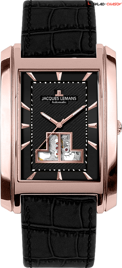 Классические часы в прямоугольном корпусе, который сделан из гипоаллергенной нержавеющей стали с PVD-покрытием из розового золота. Эргономичная форма ушек позволяет ему комфортно лежать на запястье. Циферблат черного цвета украшен гильоше в центральной зоне — на этом фоне двигаются три стрелки, показывающие время с точностью до секунды. Оригинально выполнен открытый баланс: две буквы, J и L, являются, одновременно, и логотипом бренда Jacques Lemans. Задняя крышка часов, закрепленная на 4-х винтах, прозрачна: так легко можно любоваться работой механизма Miyota с функцией автоподзавода. Черный ремешок модели выполнен из натуральной кожи. Застежка-пряжка декорирована логотипом бренда.